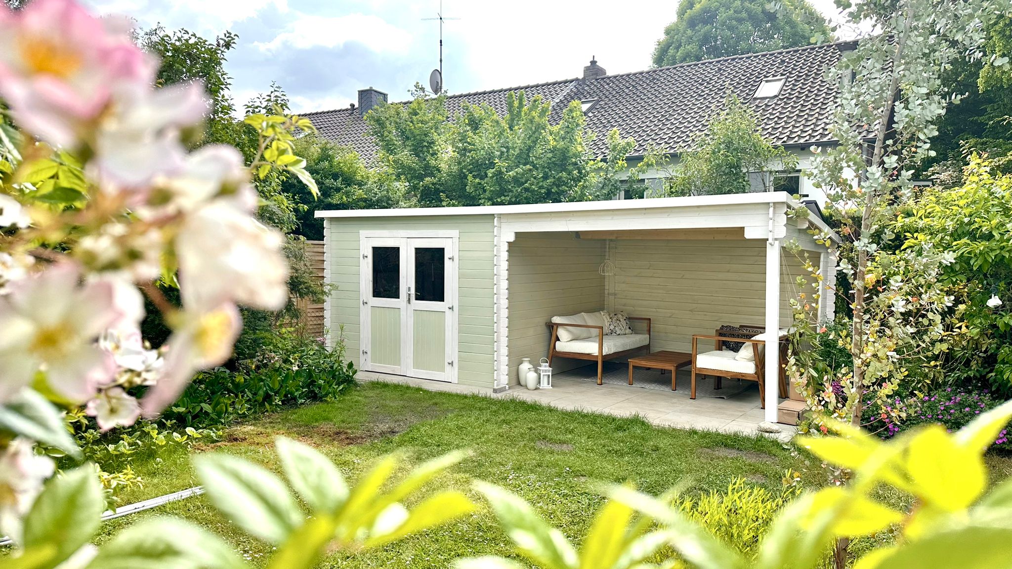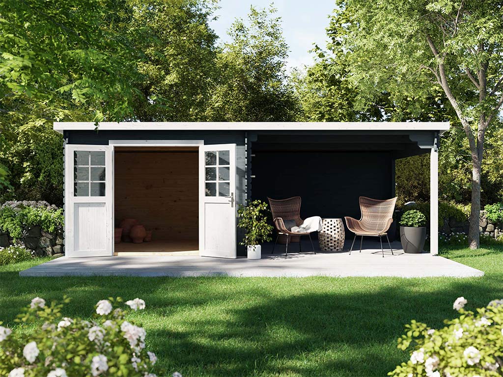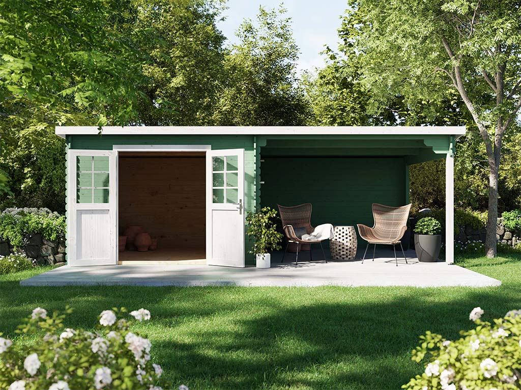 Dieses geräumige Gartenhaus besticht durch klare Formgebung, eine robuste Bauweise und dem großzügigen Anbau.