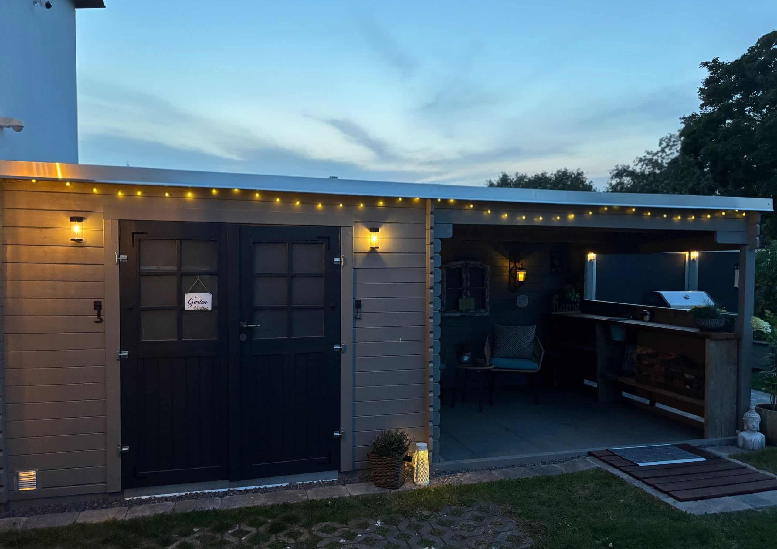 Der großzügig geschnittene 300 cm breite Anbau mit Rückenwand bietet Ihnen die Möglichkeit auch im Freien, geschützt vor Sonne und Regen den Gartentag zu genießen.