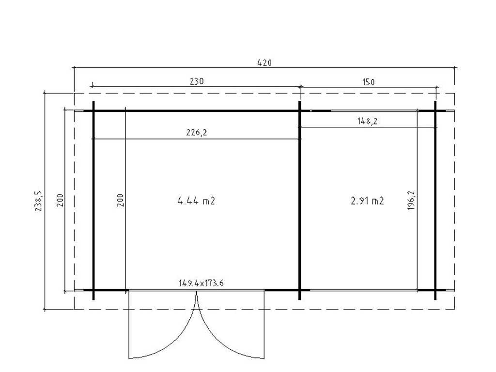 B x T x H: 420,1 x 238,5 x 211 cm, inkl. Boden + 150 cm Anbau + Doppeltür mit Lichtausschnitt