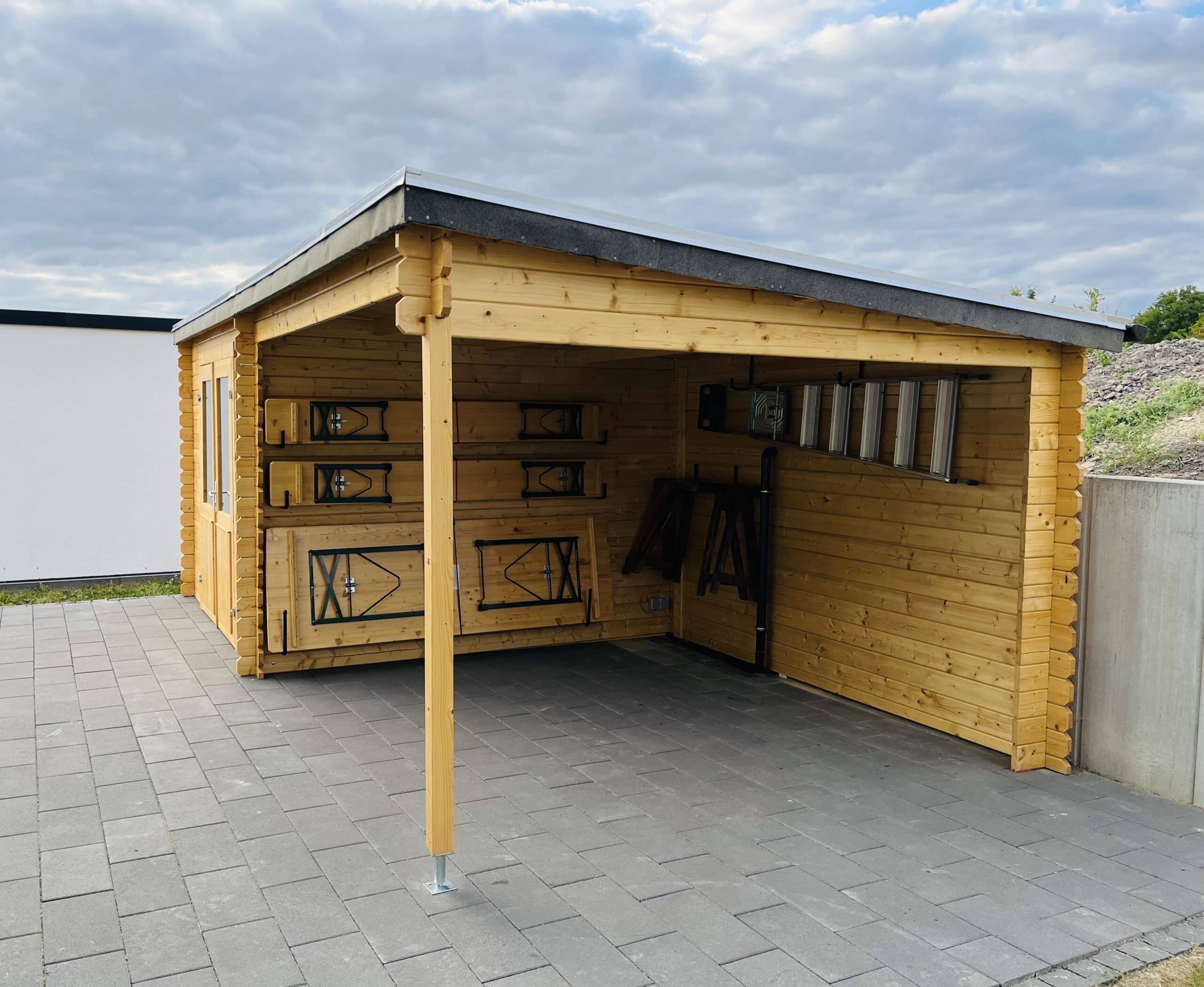 Das Gartenhaus mit Anbaudach und Rückwand ist sehr vielseitig. Der durch das Anbaudach geschaffene zusätzliche Stauraum eignet sich optimal als Lagerplatz für Gartenutensilien oder als Sitzbereich zum gemütlichen Verweilen. Dank Überdachung und integrierter Rückwand sind Geräte und Gartenmöbel optimal vor Wind und Wetter geschützt.