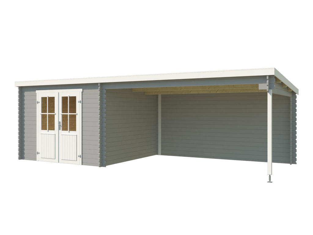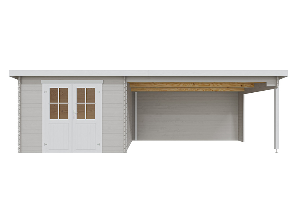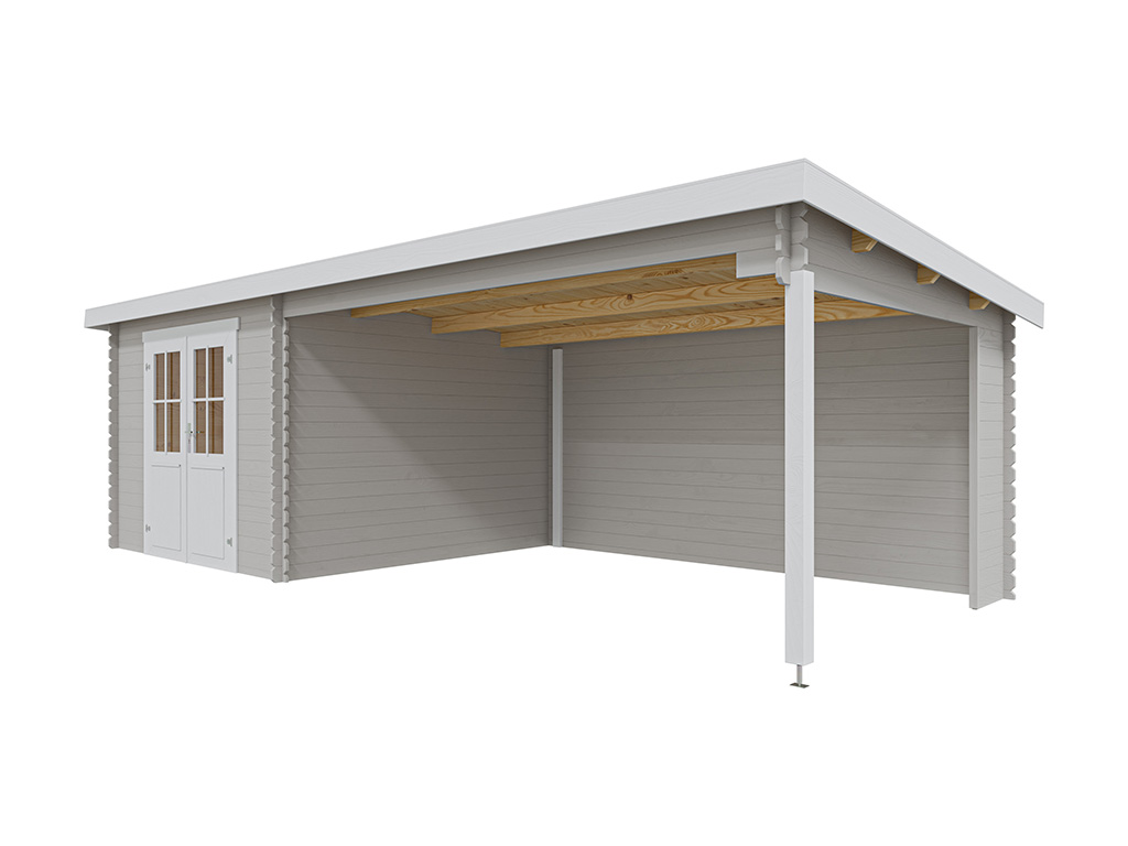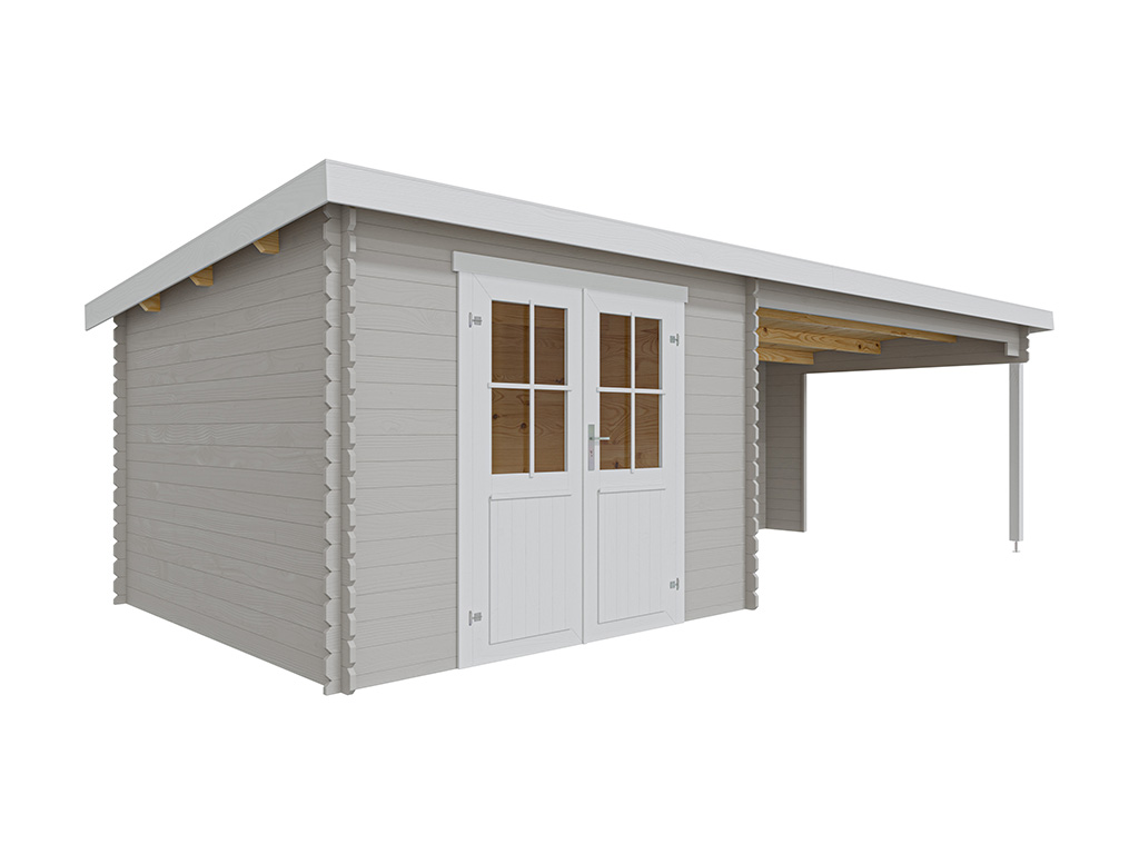 Gartenhaus Blockbohlenhaus St. Louis Exklusiv 28 mm lichtgrau mit 4 m Anbau
