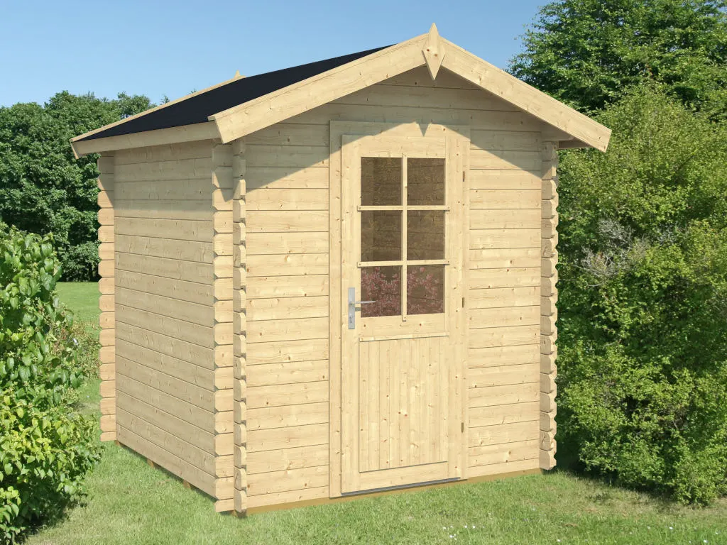 Die Wände des Blockbohlenhauses setzen sich aus vorgefertigten Holzbohlen zusammen, die dank einer Nut- und Feder-Verbindung ohne größere Anstrengungen aufeinandergesteckt werden können. Damit ist ein einfacher und schneller Auf- und Abbau garantiert. An der Kopfseite des Gartenhauses sorgt die charakteristische Verkämmung (spezielle Einkerbungen im Holz) nicht nur für eine einzigartige Optik, sondern hält das ganze Konstrukt auch zusammen und macht es absolut wind- und wetterfest.