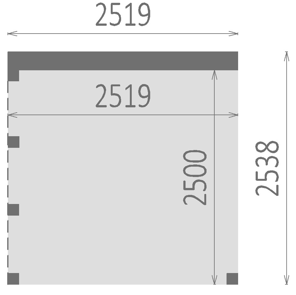 Das Sockelmaß beschreibt im Wesentlichen die Grundfläche des Gartenhauses. Gemessen wird hierbei von Außenwandmitte zu Außenwandmitte. Das Sockelmaß ist Grundlage für den Bau eines passenden Fundaments.