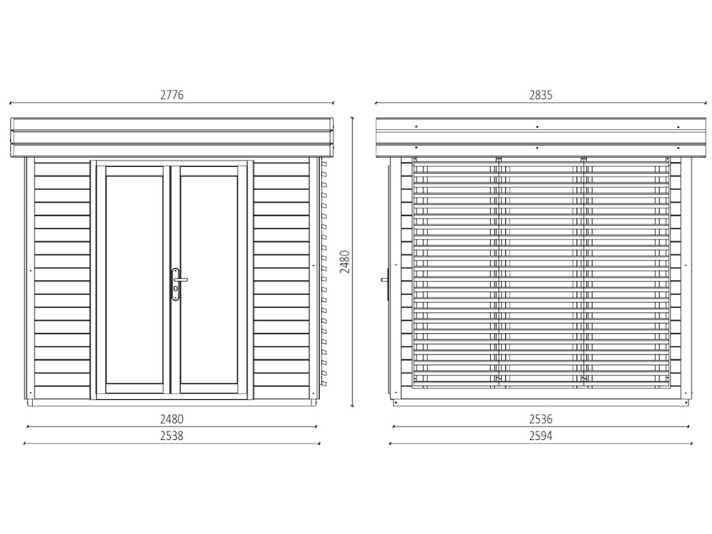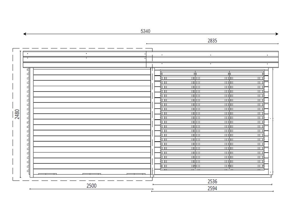 B x T x H: 534 x 278 x 248 cm, Sockelmaß Haus: B x T: 253,6 x 248 cm, inkl. große Fensterfront + 250 cm Anbau