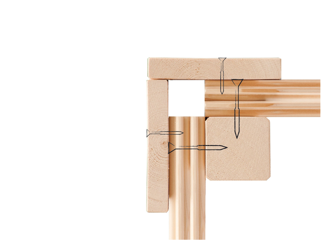 Das Gartenhaus wird im Steck-/Schraubsystem montiert, welches eine einfache und schnelle Montage ermöglicht. Die Ecken der Wandbohlen werden mit hochkant angebrachten Zierleisten verdeckt, die die Stirnkanten des Hauses sowie Nagelköpfe vor Witterungseinflüssen schützen. - Farblich vorbehandelt