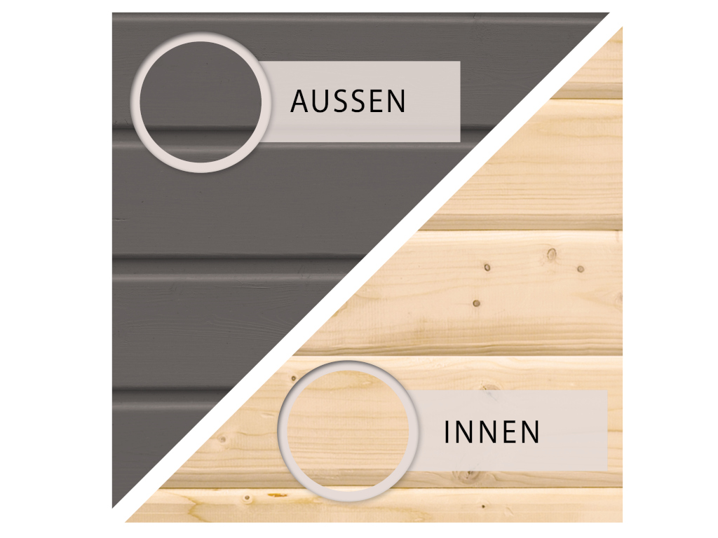 Das Gartenhaus wird bereits inklusive Farbanstrich in der Farbe Terragrau geliefert und dein neues Gartenaus ist somit bereits gegen Witterungseinflüsse und Schädlingsbefall geschützt. Dein Vorteil: Es ist kein Erstanstrich nötig - Einfach aufbauen und genießen. Die naturbelassene Innenseite sorgt für ein natürliches Wohngefühl im Innenraum. Bitte beachte, dass ein zeitnaher Innenanstrich mit einer transparenten Holzschutzlasur notwendig ist, um einem Verziehen der Bohlen entgegenzuwirken. Beachte hierzu die Hinweise in der beiliegenden Montageanleitung - 19 mm Massivholzdach