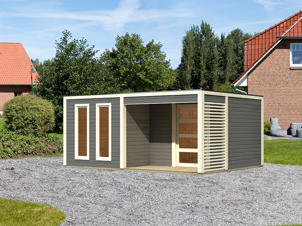 Mit diesem modernen Flachdach Gartenhaus in L-Form liegst Du voll im Trend. Dieses Gartenhaus überzeugt mit seinem modernen Terrassenhaus Design und ist der ideale Ort für dein Homeoffice oder zum gemütlichen Verweilen in deinem Garten. Durch die L-Form ergeben sich zwei große offene Bereich, die z.B. in Arbeits- und Wohnbereich getrennt werden können. - Großzügiges Raumangebot