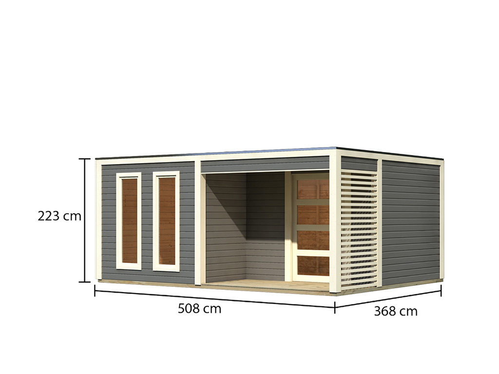 Dieses Premium Gartenhaus verfügt über ein Außenmaß von 508 x 368 cm. Eine optimale Raumnutzung wird dank einer Firsthöhe von 223 cm gewährt. Das Raumangebot wird durch die ca. 261 x 125 cm große überdachte Terrasse mit moderner Lamellenwand und platzsparender Schiebetür erweitert. - 38 mm starke Wandbohlen