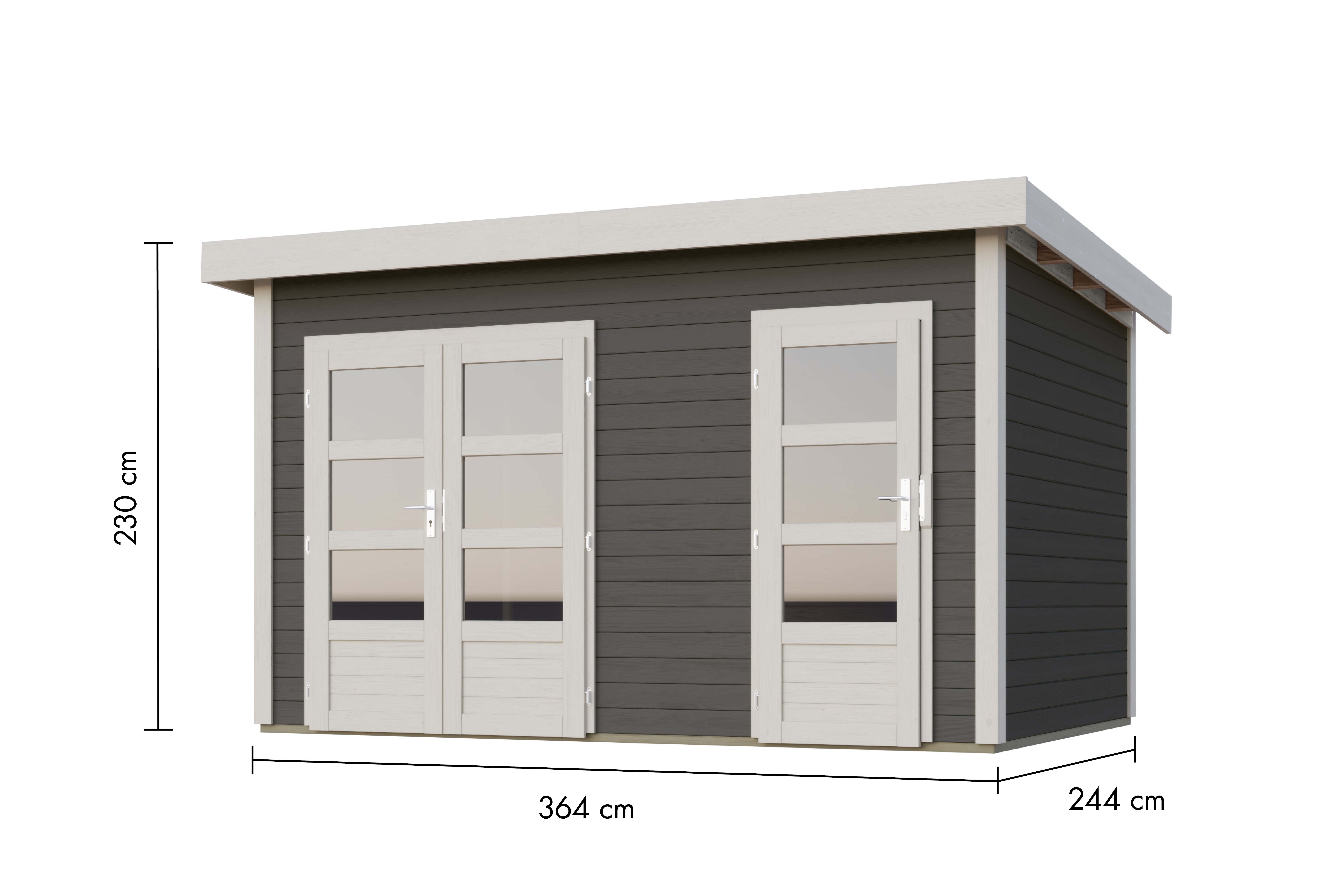 Mit diesem Flachdach-Gartenhaus liegen Sie voll im Trend. Die durch eine Trennwand geschaffenen zwei Räume mit separatem Eingang bieten die Möglichkeit das Gartenhaus sowohl als gemütlichen Rückzugsort wie auch als Gerätehaus zu nutzen. - Lichtdurchflutete Räume