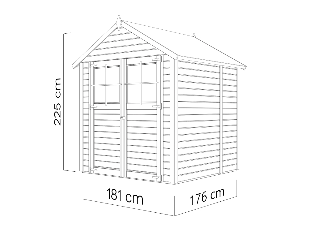 Die Grundfläche des Gartenhauses beträgt 3,15 m². Das Sockelmaß (Haus ohne Anbau) liegt bei 180 x 175 cm (B x T). Das Sockelmaß liegt bei 180 x 175 cm (B x T). Eine optimale Raumnutzung wird dank einer Firsthöhe von 225 cm gewährt.
