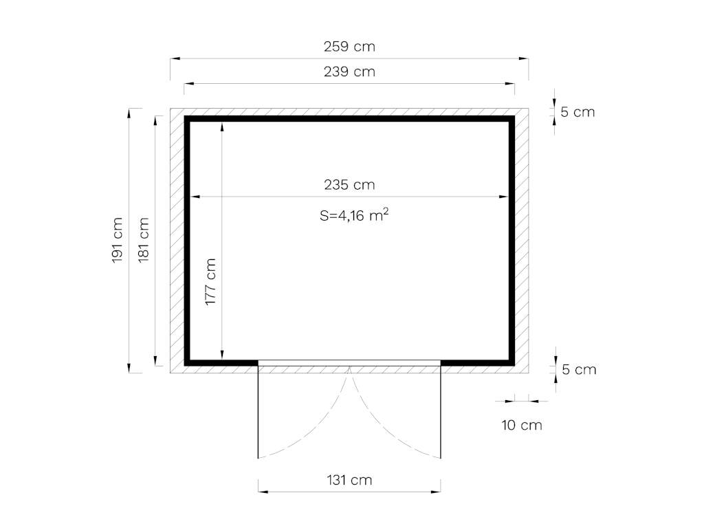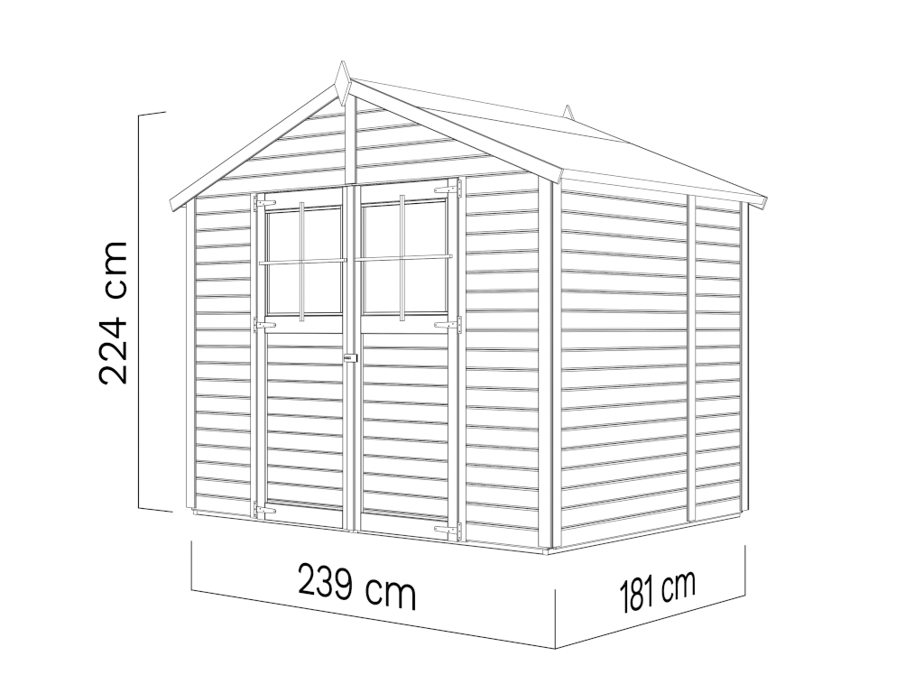 Die Grundfläche des Gartenhauses beträgt 4,33 m². Das Sockelmaß (Haus ohne Anbau) liegt bei 239 x 181 cm (B x T). Das Sockelmaß liegt bei 239 x 181 cm (B x T). Eine optimale Raumnutzung wird dank einer Firsthöhe von 223 cm gewährt.