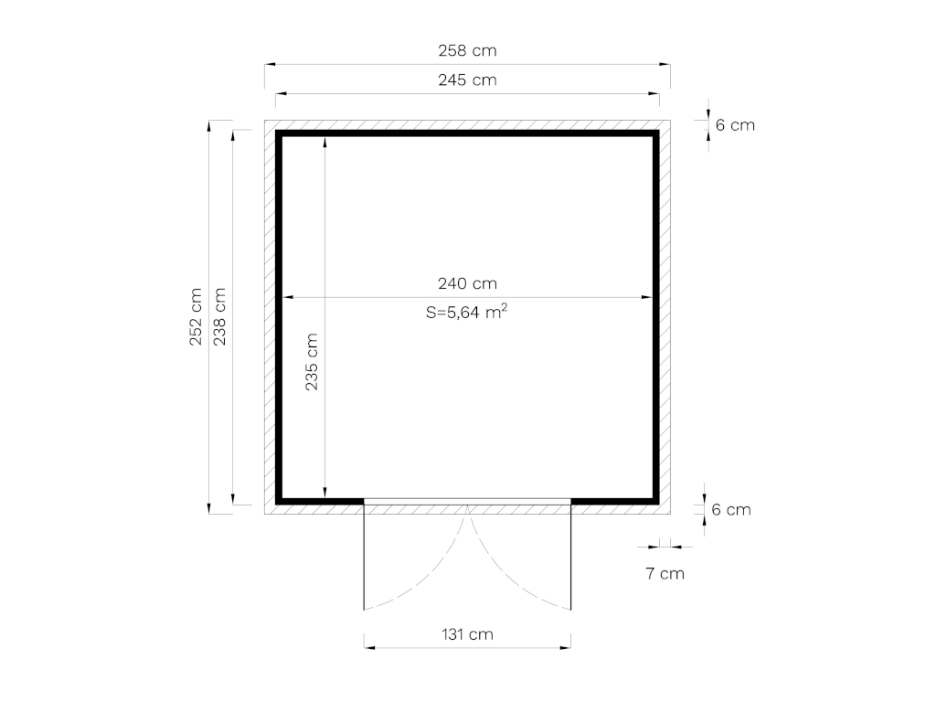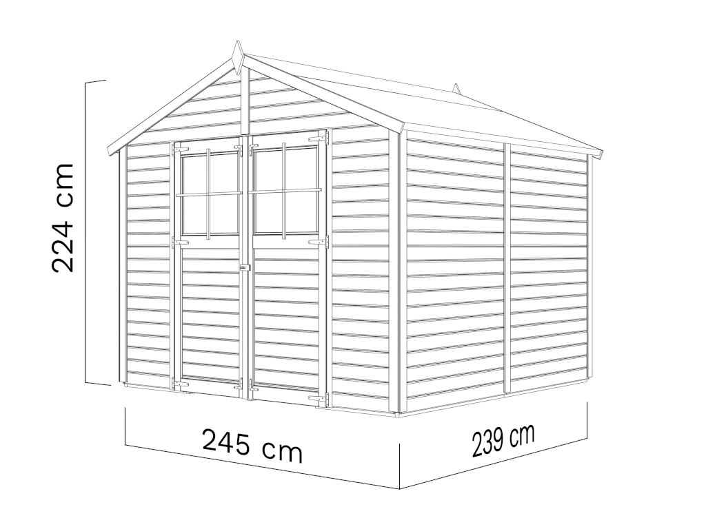Die Grundfläche des Gartenhauses beträgt 5,83 m². Das Sockelmaß (Haus ohne Anbau) liegt bei 245 x 238 cm (B x T). Das Sockelmaß liegt bei 245 x 238 cm (B x T). Eine optimale Raumnutzung wird dank einer Firsthöhe von 223 cm gewährt.