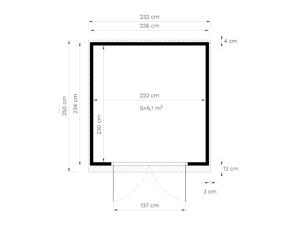 Die Grundfläche des Gartenhauses beträgt 5,11 m². Das Sockelmaß liegt bei 226 x 234 cm (B x T). Eine optimale Raumnutzung wird dank einer Firsthöhe von 232 cm gewährt.