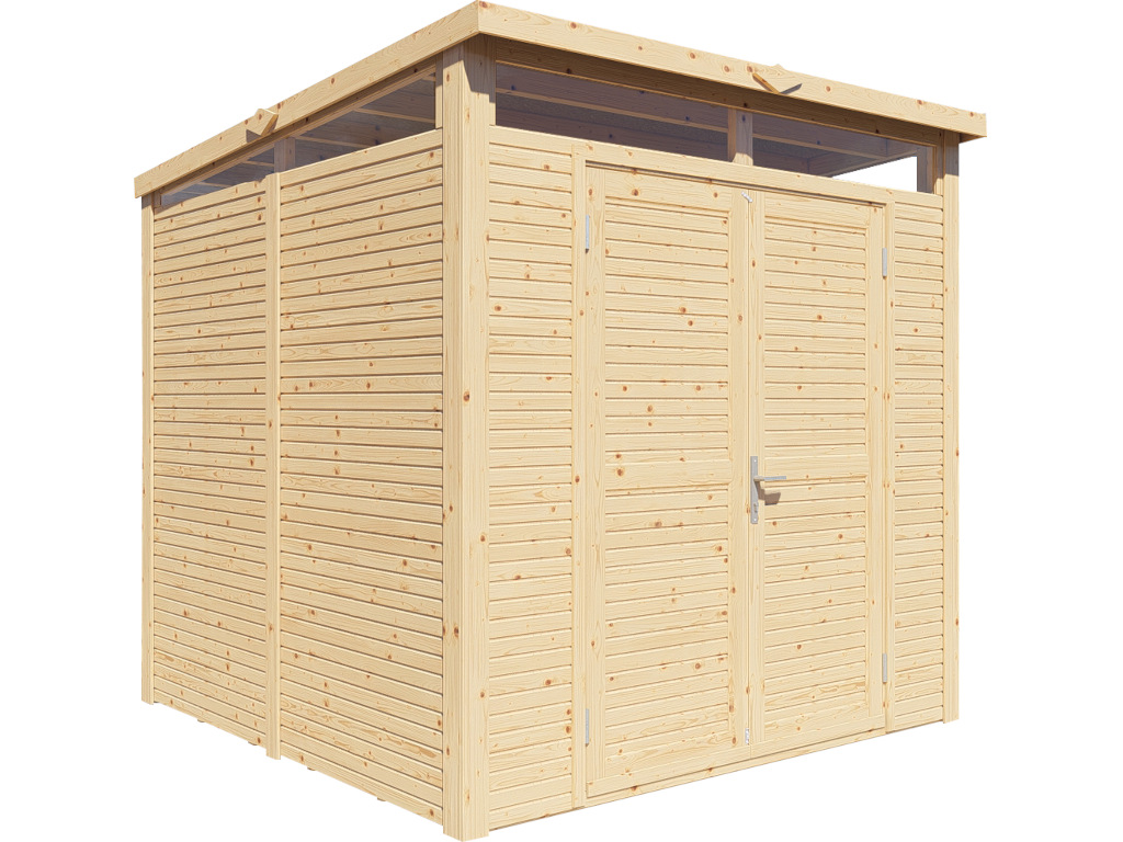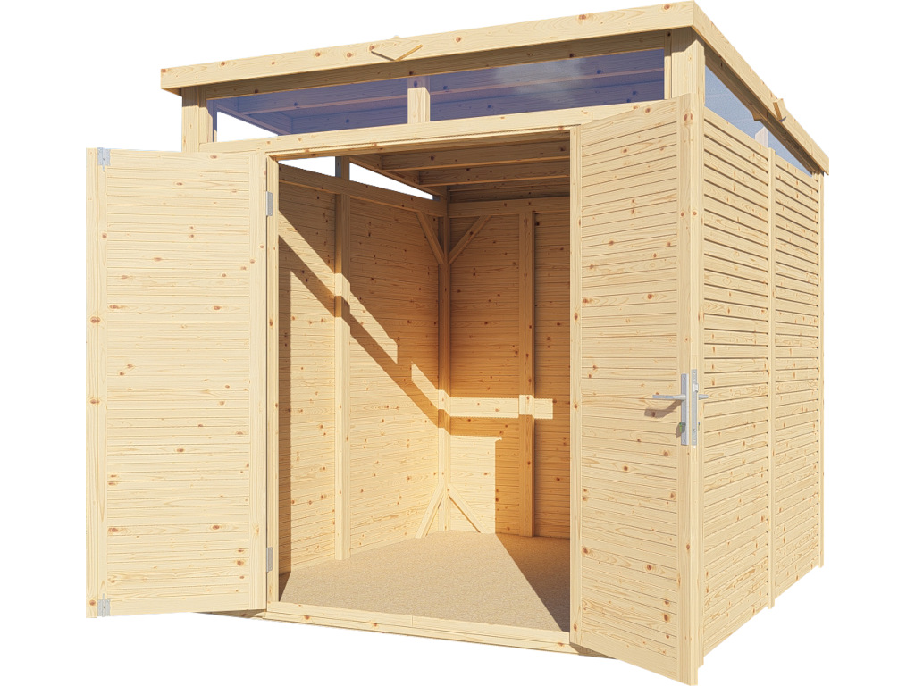 Ein modernes Pultdach aus Massivholz mit Nut- und Feder-Verbindung verleiht deinem Gartenhaus eine stilvolle, elegante Optik. Durch nur eine geneigte Dachfläche ist die Nutzungsfläche im Inneren des Gartenhauses deutlich weniger eingeschränkt und der Verlust an Nutzraum gering. Zudem lässt die Neigungsseite des Pultdaches das Regenwasser gut abfließen und es ist die Montage von nur einer Regenrinne nötig.