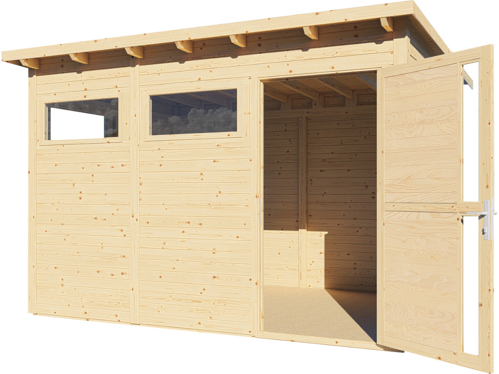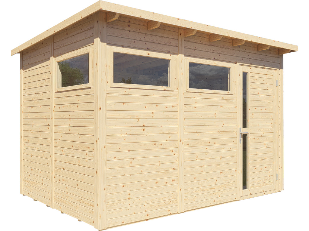 Ein modernes Pultdach aus Massivholz mit Nut- und Feder-Verbindung verleiht deinem Gartenhaus eine stilvolle, elegante Optik. Durch nur eine geneigte Dachfläche ist die Nutzungsfläche im Inneren des Gartenhauses deutlich weniger eingeschränkt und der Verlust an Nutzraum gering. Zudem lässt die Neigungsseite des Pultdaches das Regenwasser gut abfließen und es ist die Montage von nur einer Regenrinne nötig.