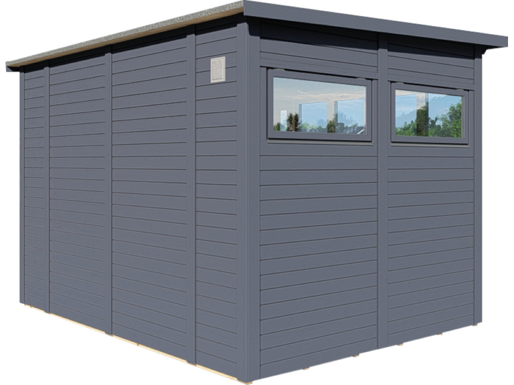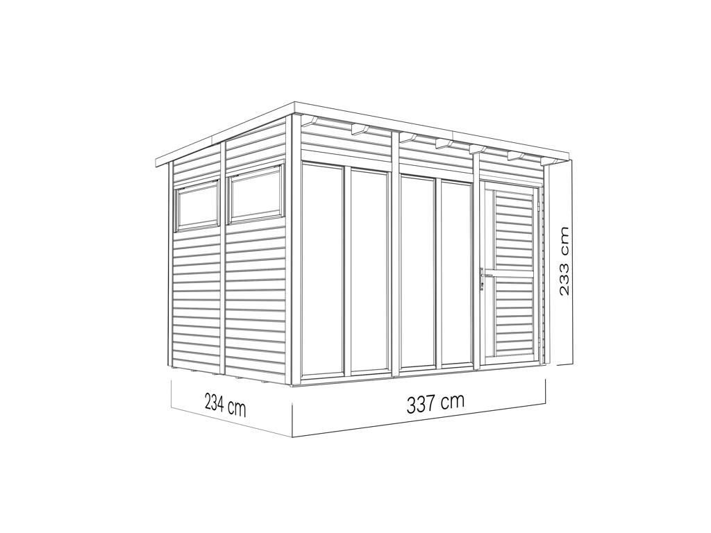 Das Punta 3 Premium ist ein großzügiges Gartenhaus mit modernem Pultdach. Bodentiefe Fenster lassen viel Licht in den Raum mit einem Grundmaß von ca. 7,9 m². Die einfach verglasten Seitenfenster aus Sicherheitsglas lassen sich zur Belüftung öffnen. Sämtliche Elemente und Holzteile sind für eine gelungene Montage exakt vorgefertigt. Die Leimholztür mit Zylinderschloss gewährt mit den Maßen 186 x 91 cm einen großzügigen Zugang und ist für einen langfristigen Erhalt beidseitig farbig endbehandelt.