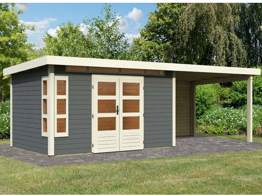 Das Gartenhaus wird aus 28 mm starken Wandbrettern aus nordischer Fichte im Steck-/Schraubsystem gefertigt und gewährleistet somit einen einfachen Aufbau und eine stabile Konstruktion. Das Pultdach besteht aus Massivholzdach.