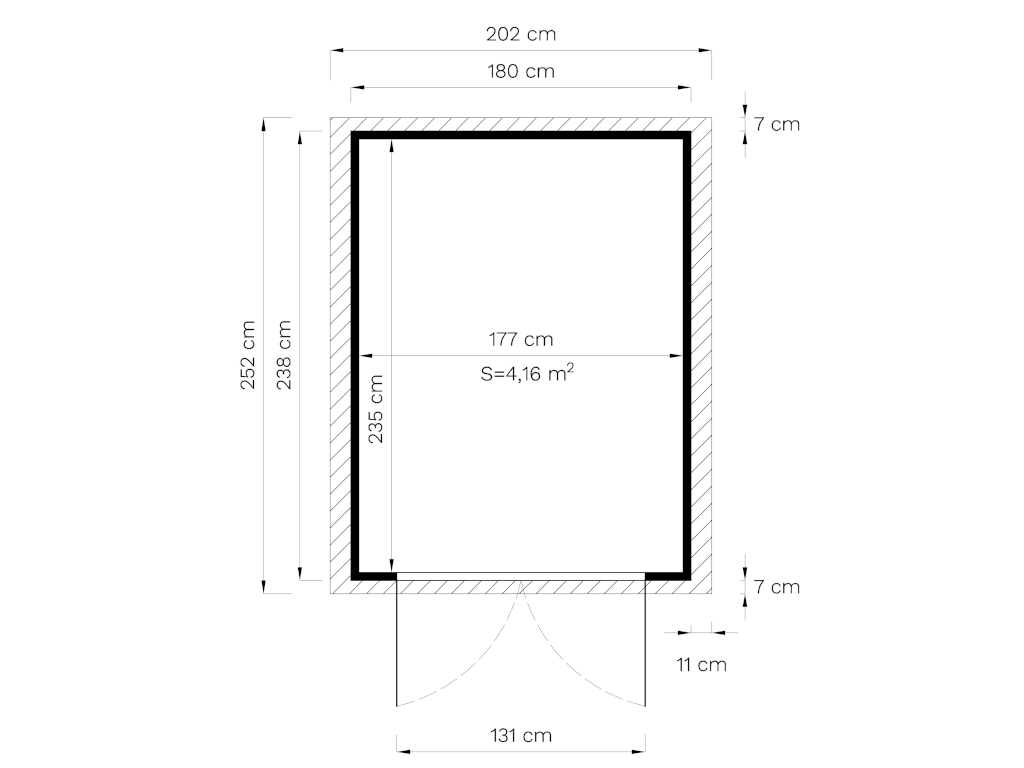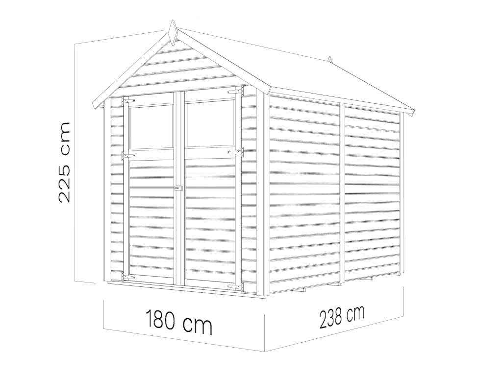 Die Grundfläche des Gartenhauses beträgt 4,28 m². Das Sockelmaß (Haus ohne Anbau) liegt bei 180 x 238 cm (B x T). Das Sockelmaß liegt bei 180 x 238 cm (B x T). Eine optimale Raumnutzung wird dank einer Firsthöhe von 225 cm gewährt.