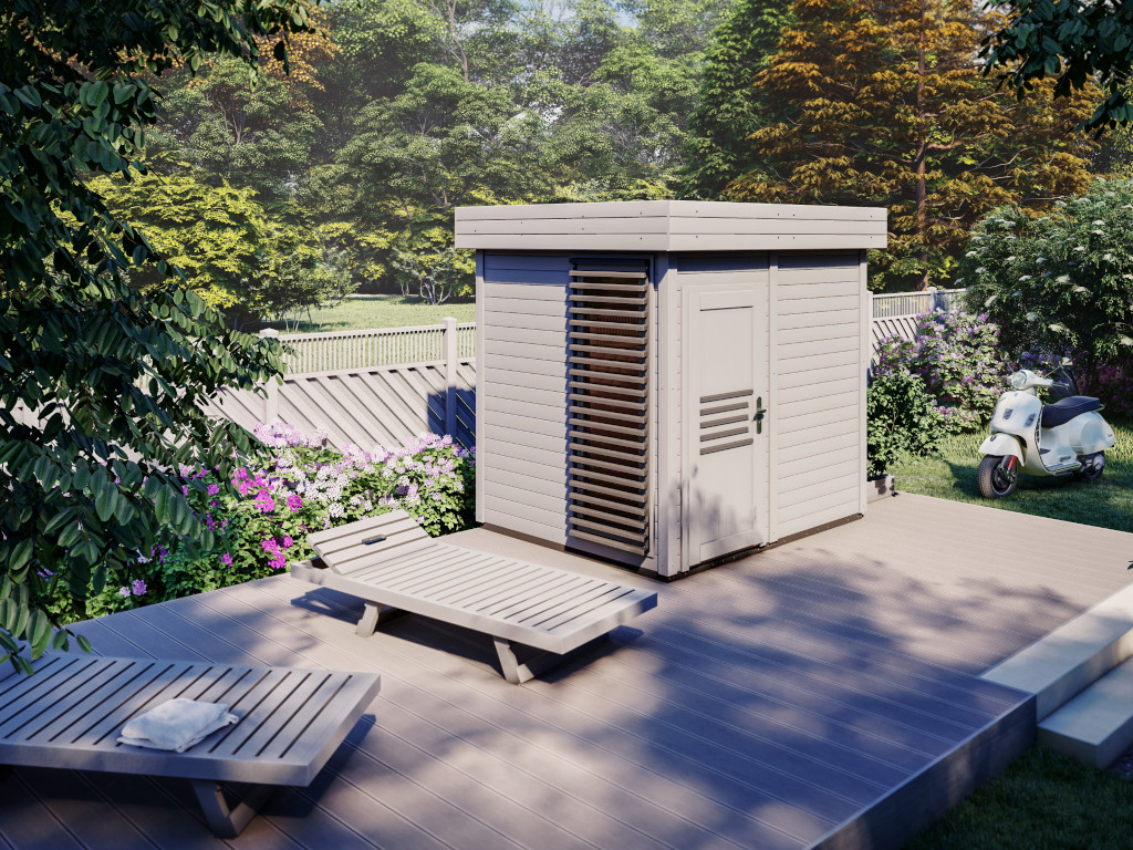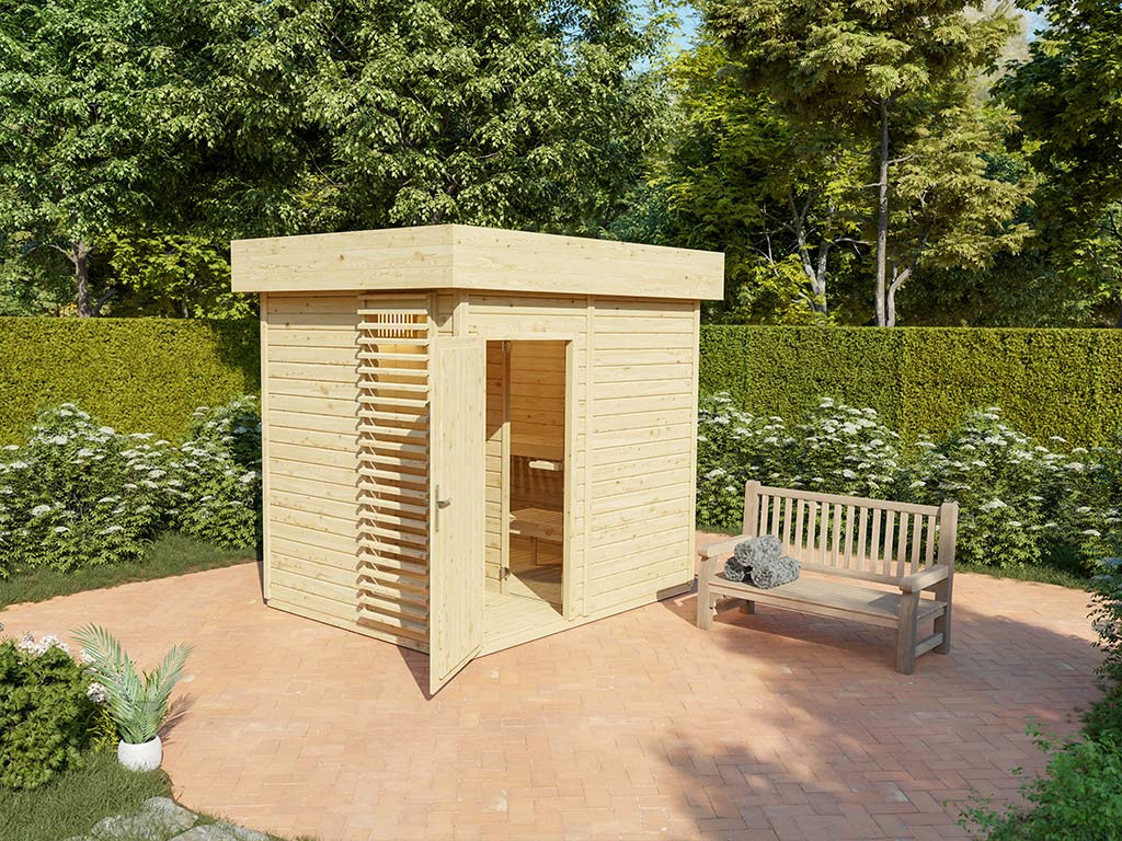 Gartensauna Amos 40 mm mit 9 kW Bio-Kombiofen und ext. Steuerung