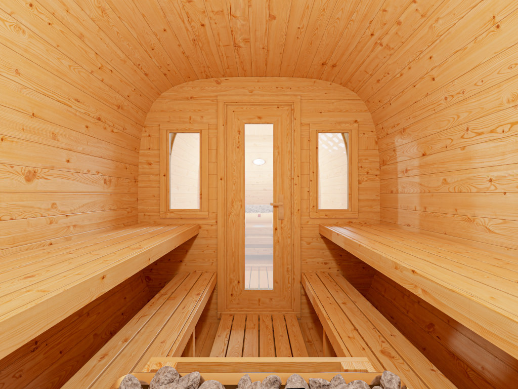 Fasssaunen ziehen mit ihrer außergewöhnlichen Optik nicht nur alle Blicke auf sich, sondern bieten auch hervorragende technische Eigenschaften. Die runde Form ermöglicht eine optimale Luft- und Wärmezirkulation sowie ein besonders schnelles, sparsames Erhitzen ohne unangenehmen Hitzestau in den Ecken und unter der Decke. Dank ihrer kompakten Form und geringen Grundfläche sind Fasssaunen besonders gut für kleine Gärten geeignet. In dieser Sauna können 4-6 Personen gleichzeitig saunieren.