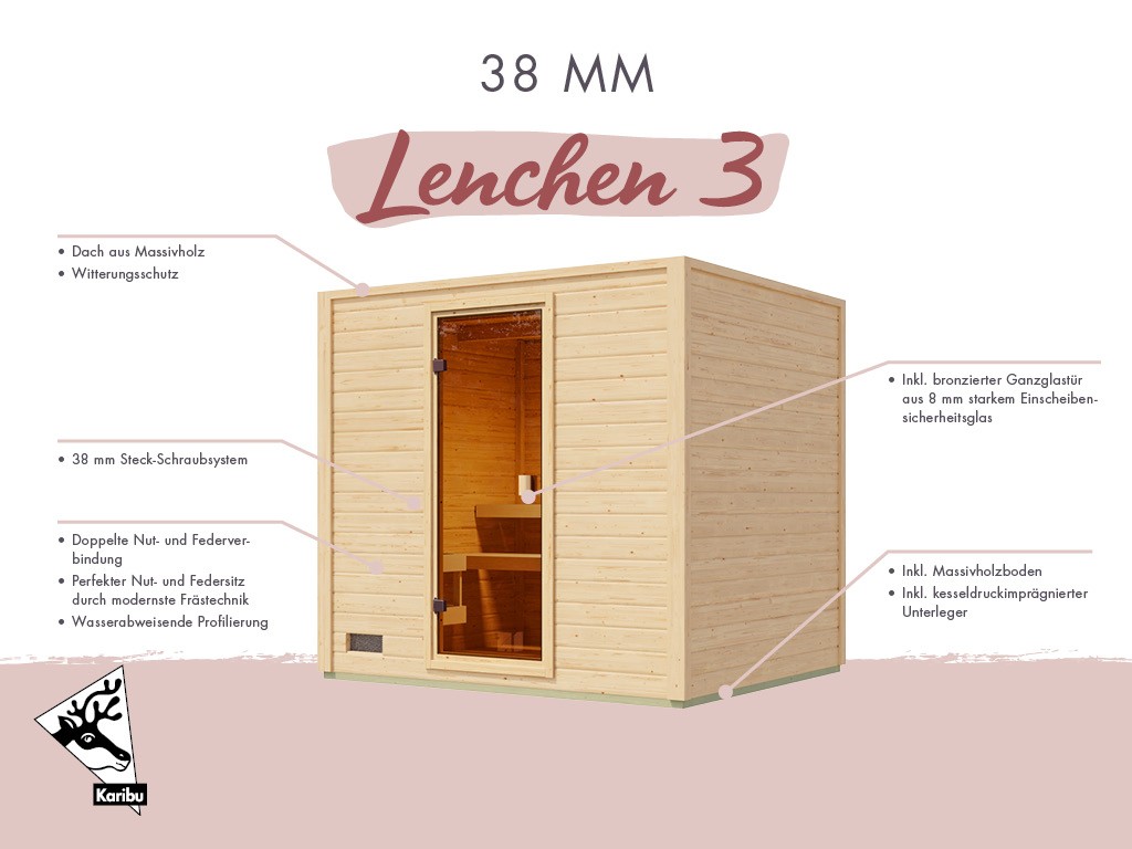 Dieses Saunamodell – eine System- bzw. Elementsauna – zeichnet sich durch seine besondere Sandwich-Bauweise aus, d. h., die Wandelemente bestehen aus einzelnen Schichten. Die bereits vorgefertigten Wandelemente aus Fichte ermöglichen einen schnellen Aufbau innerhalb weniger Stunden. Mit einer Wandstärke von 38 mm sind Systemsaunen optimal isoliert und somit besonders energiesparend. Wegen der sehr gut gedämmten Elemente heizt sich die Systemsauna extra schnell auf.