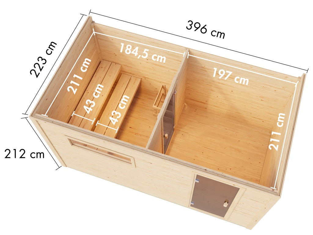 B x T x H: 396,1 x 224,9 x 212,4 cm, inkl. 2 Liegen, 9 kW Bio-Saunaofen mit externer Steuerung und Saunasteinen