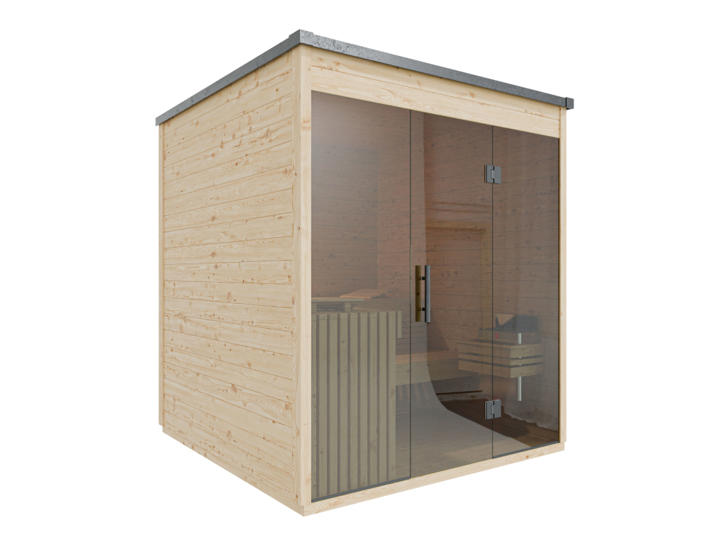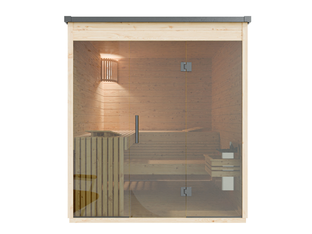 Die Sauna verfügt über eine bronzierte Klarglas-Ganzglastür.