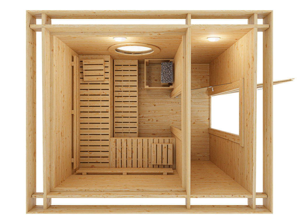 B x T x H: 252,2 x 312 x 250, inkl. 2 Liegen, mit Vorraum, ohne Saunaofen