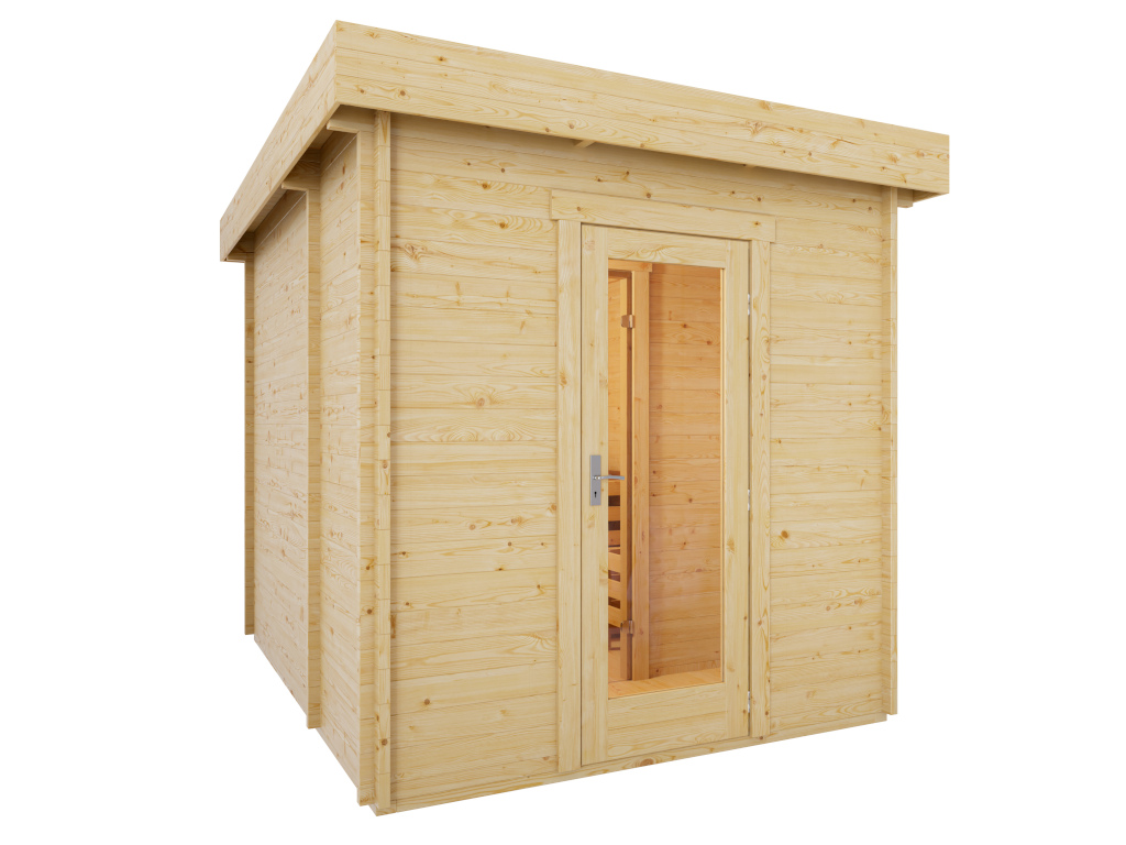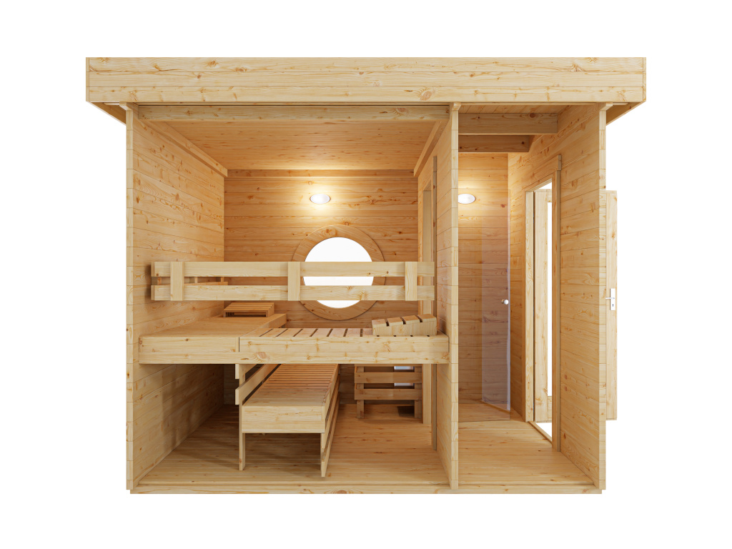 - Bodenrost aus fußwarmem Fichtenholz: für angenehmes Auftreten innerhalb und außerhalb der Sauna.