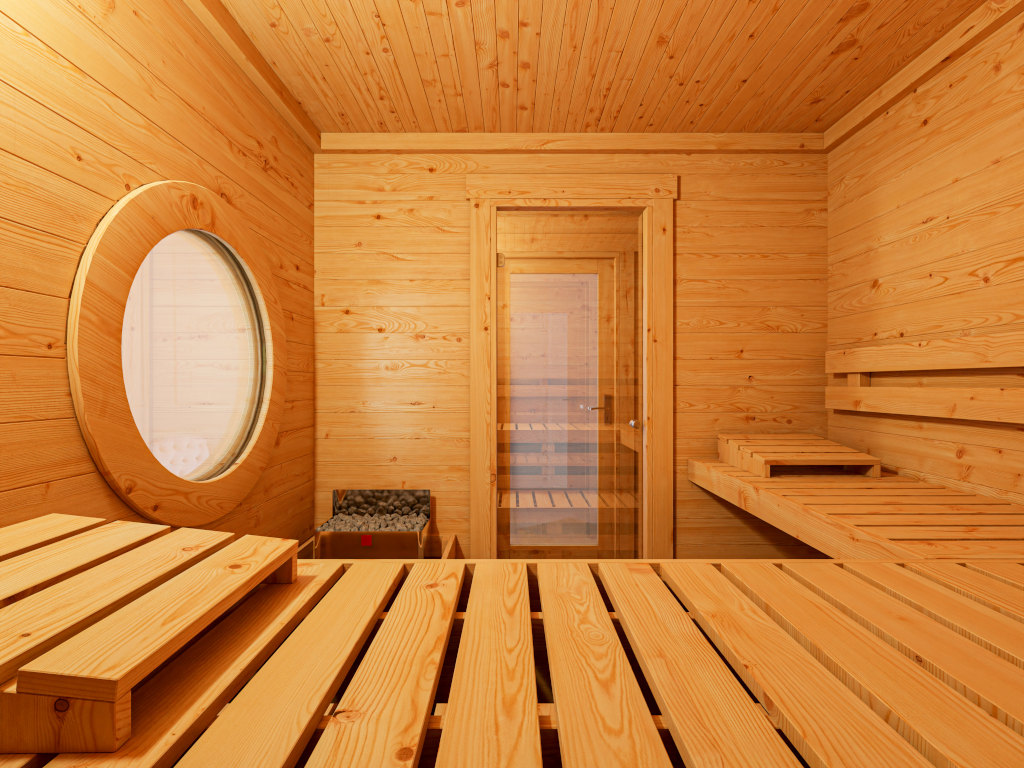 Lieferumfang: | 2 Liegen, Ofenschutz, 9kW Saunaofen, externe Steuerung, Steine |