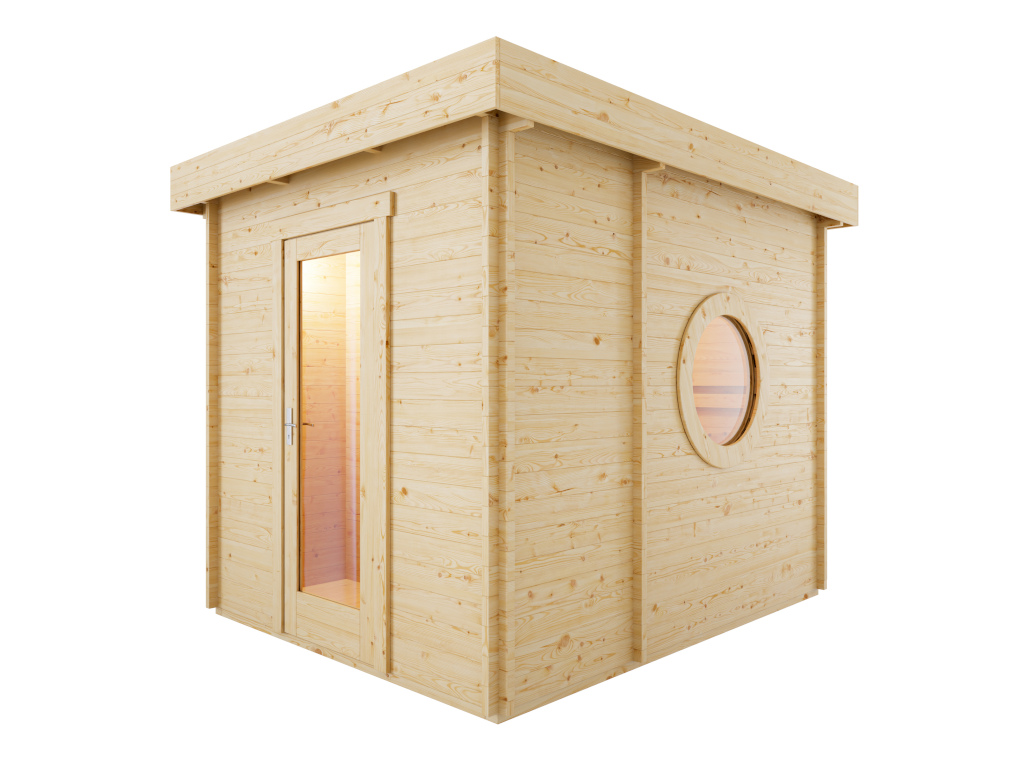 Die massiven Bohlen aus nordischer Fichte fungieren als natürliche Isolierung. Weitestgehend frei von Astlöchern und Harz sowie geringe Splittergefahr zeichnen Fichtenholz als ideales Saunaholz aus. Die gute Wärmespeicherkapazität bewirkt, dass hohe Temperaturen lange bewahrt und dosiert abgegeben werden. Das vollkommen natürliche Erlebnis einer Massivholzsauna wird durch holzeigene Harze und ätherische Öle abgerundet, die einen typischen Holzgeruch verströmen.