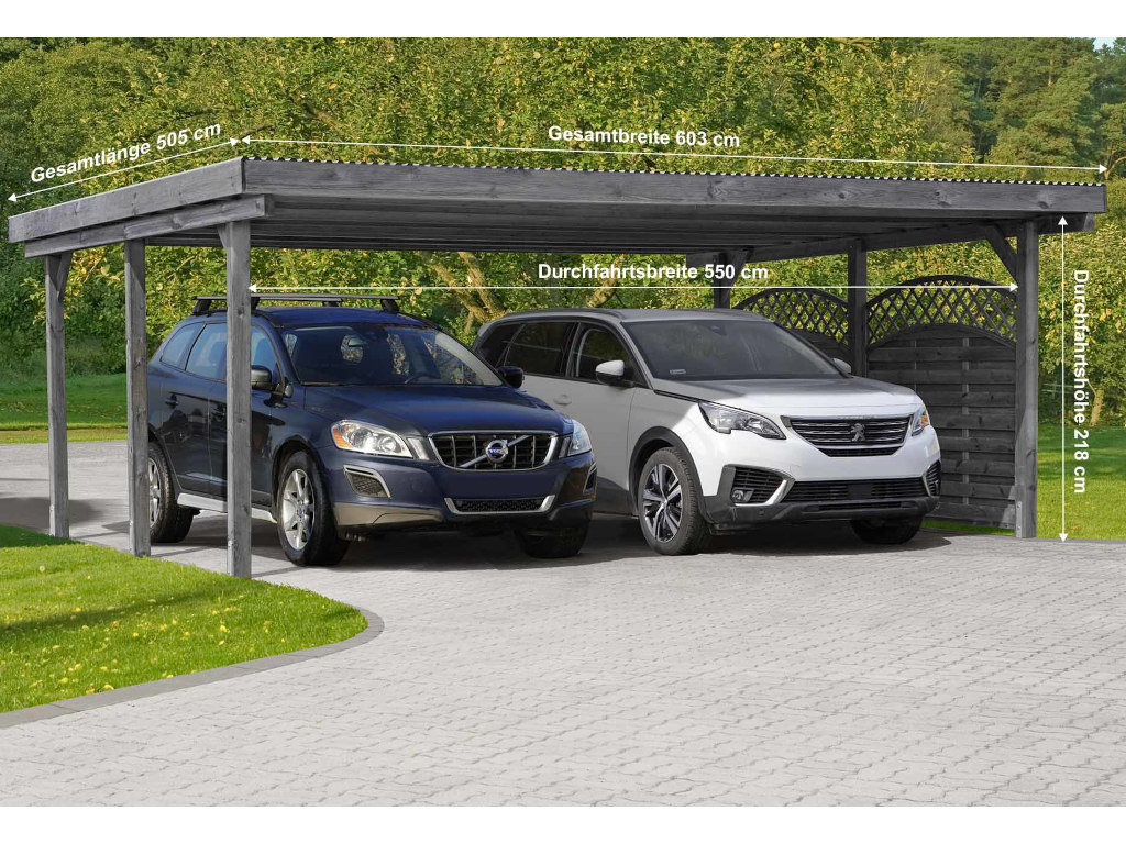 Ein Carport ist die ideale Lösung, um dein Auto vor der Witterung und Vogelkot zu schützen. Plus: Die offene Bauweise mit guter Luftzirkulation gewährleistet eine schnelle Trocknung bei Regen und Schnee und sorgt so für optimalen Korrosionsschutz. Mit einer Größe von 603 x 505 x 218 cm (B x T x H) bietet dieser Carport ausreichend Platz für zwei Fahrzeuge und mehr.