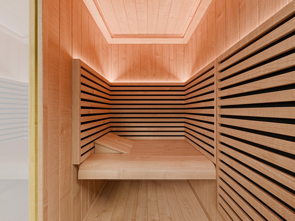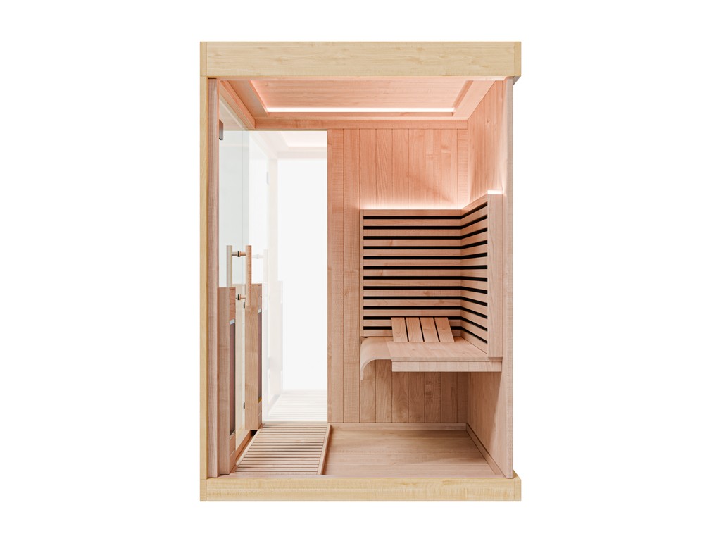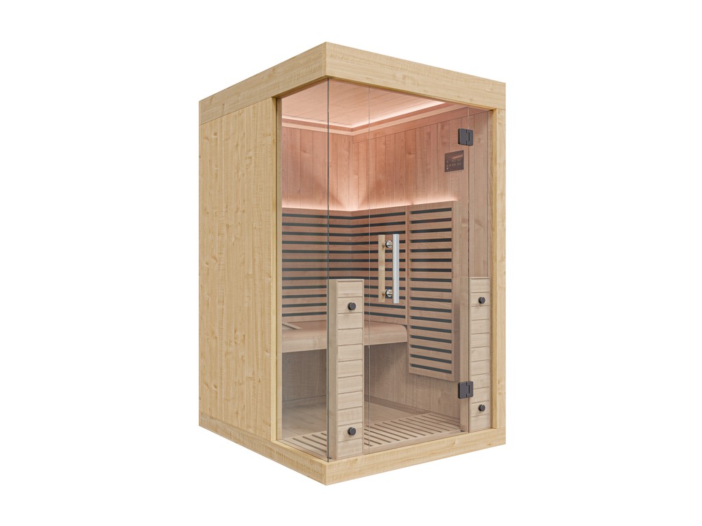 Die Infrarotkabine erzielt eine effektive Tiefenerwärmung, die zur Entspannung der Muskulatur und zum Lösen von Verspannungen führt. Diese kommen auch in therapeutischen Einrichtungen zur Anwendung. In dieser Kabine können 1–2 Personen gleichzeitig ein Infrarot-Wärmebad genießen. - Fronteinstieg