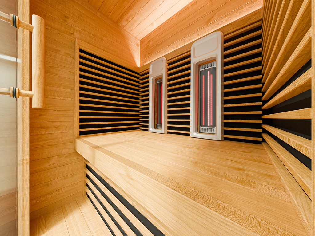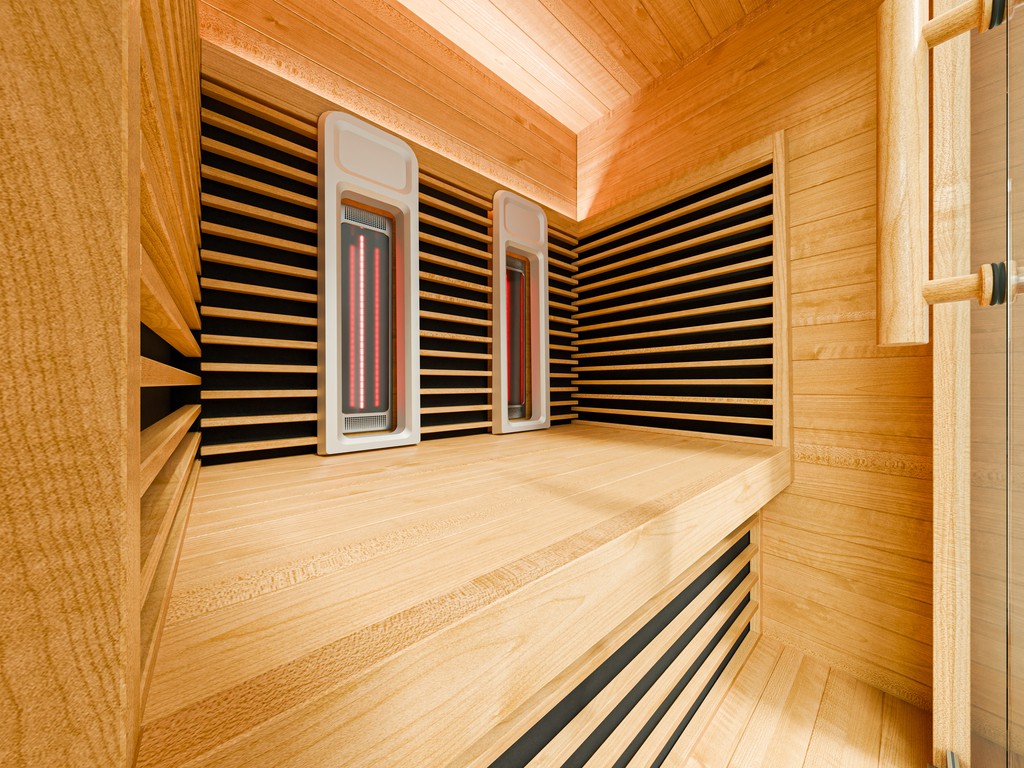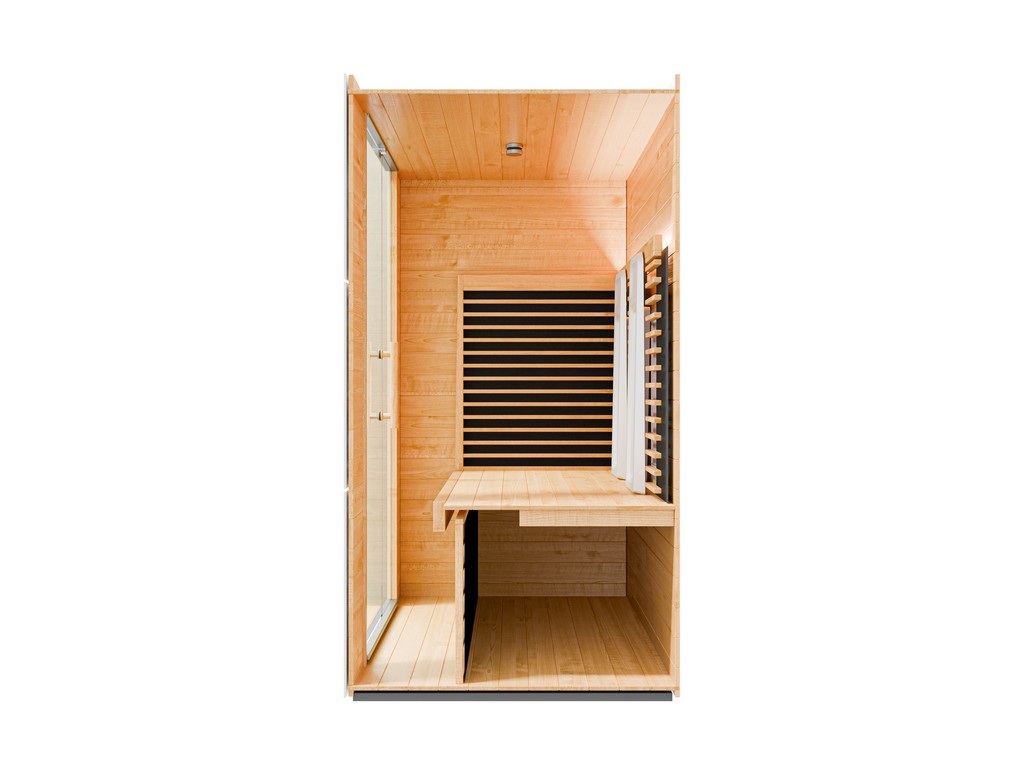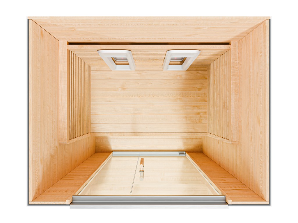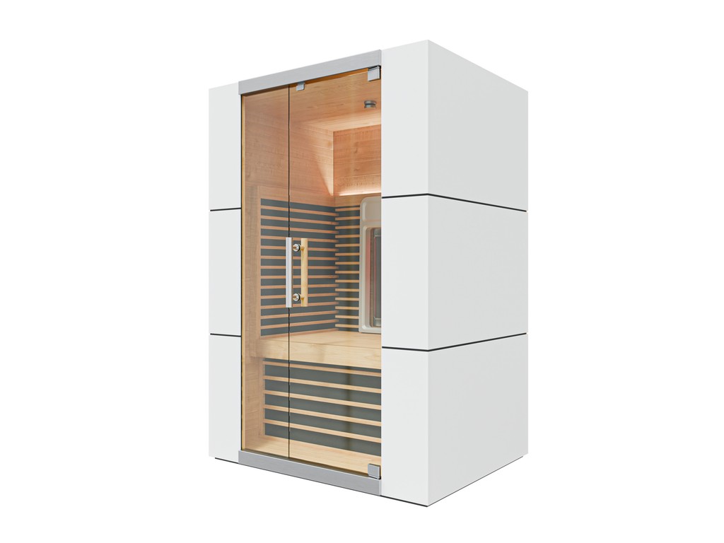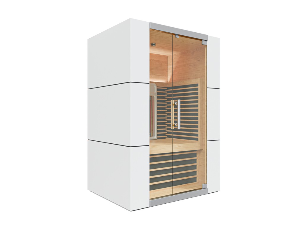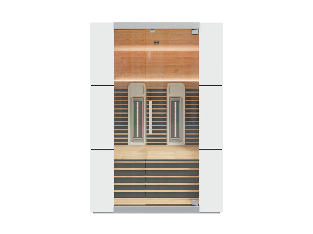 Die Infrarotkabine erzielt eine effektive Tiefenerwärmung, die zur Entspannung der Muskulatur und zum Lösen von Verspannungen führt. Diese kommen auch in therapeutischen Einrichtungen zur Anwendung. In dieser Kabine können 1–2 Personen gleichzeitig ein Infrarot-Wärmebad genießen. - Kanadisches Hemlockholz