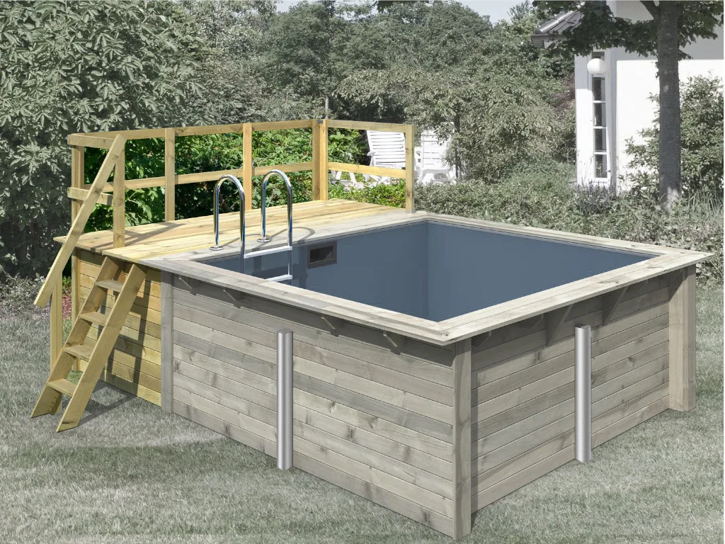 Eine Podesthöhe von 124 cm und Terrassenbreite von 142 cm bereiten einen perfekten Einstieg in den Pool und ausreichend Fläche für einen Liegestuhl und eine große Topfpflanze für den grünen Look. Die Poolterrasse schließt optimal an den Pool an und lässt sich bequem mit einer Holzleiter erklimmen.