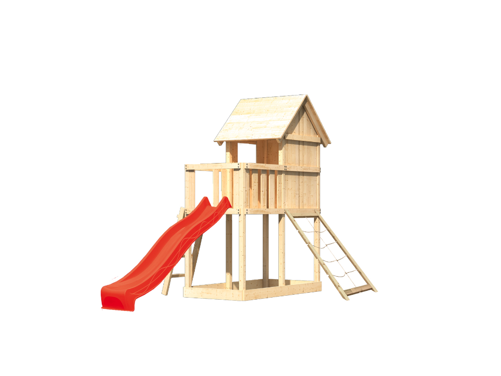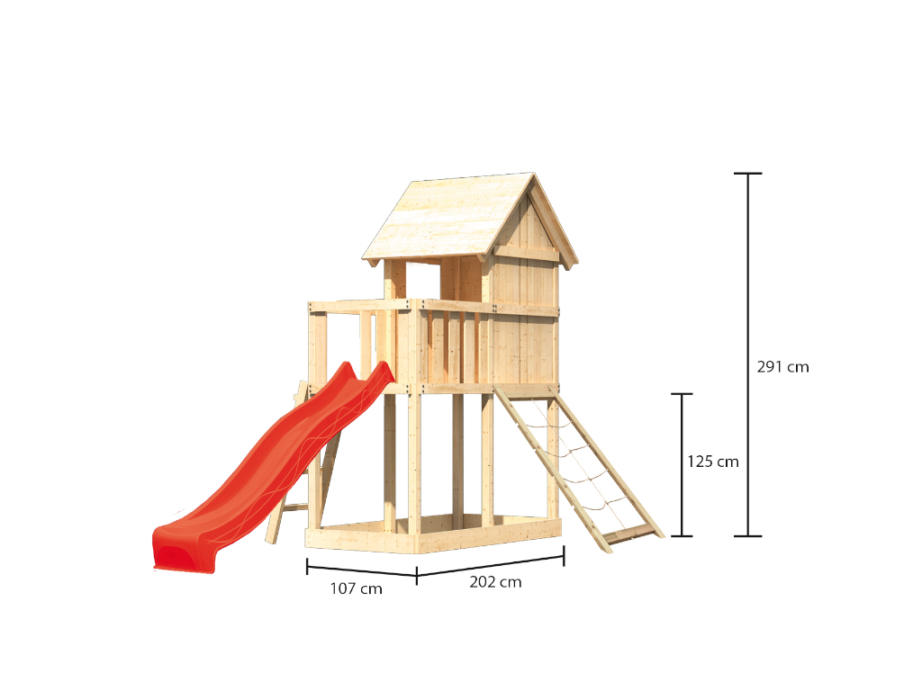 Material: Holz, B x T x H: 107 x 107 x 291 cm, inkl. Netzrampe, Rutsche rot