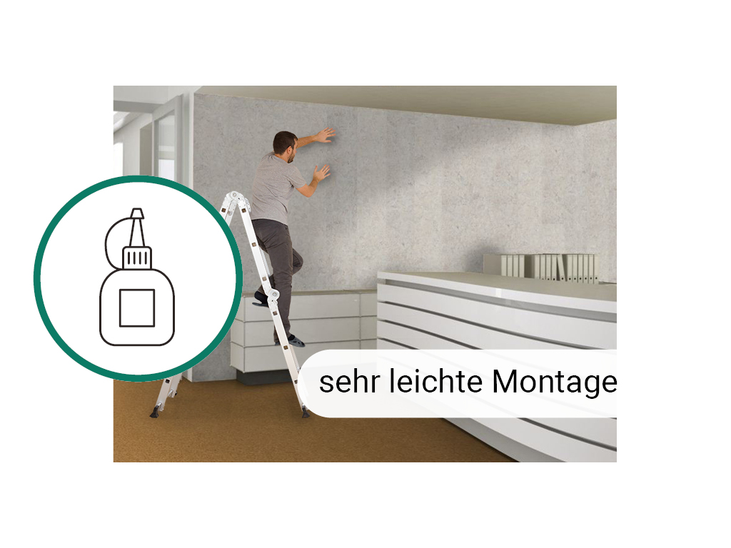Die Montage ist unkompliziert und lässt sich in wenigen Handgriffen selbst erledigen. Dazu wird der Kontaktkleber auf der Fliese angebracht und diese in die gewünschte Richtung ausgerichtet. Zum Schluss wird die Korkfliese nur noch an die Wand gedrückt und nochmals feinjustiert.