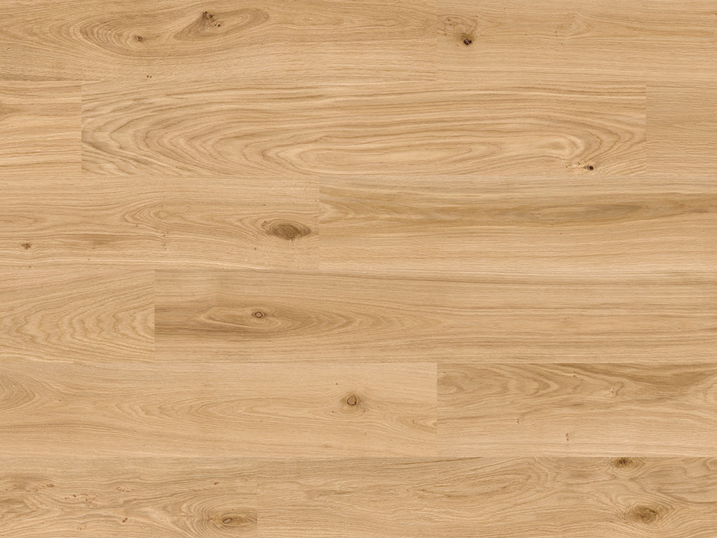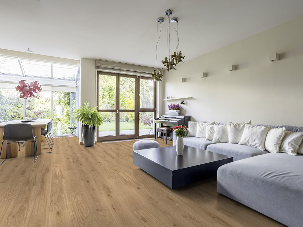 Das Dekor in authentischer Eichenholzoptik vermittelt fühlbare Wärme und Behaglichkeit. Die hochwertige Landhausdielenoptik dieses Korkbodens fügt sich optimal in jeden Einrichtungsstil ein. Das Ein-Stab-Design wirkt harmonisch und elegant. Die fugenlose Optik wirkt modern, raumöffnend sowie elegant und sorgt für ein nahtloses Verlegebild mit ebenmäßiger Raumwirkung.