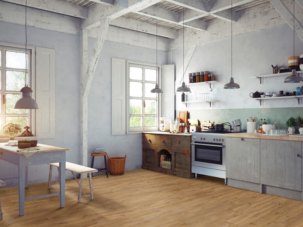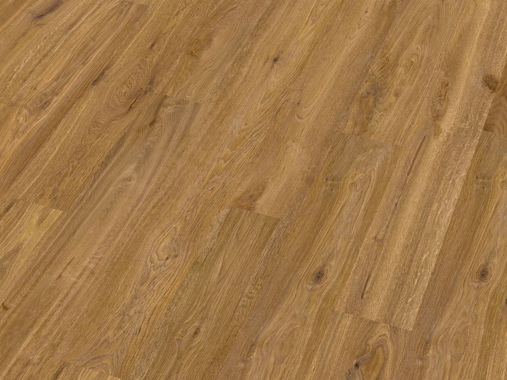 Die markante Eichenholzmaserung des Dekors vermittelt Behaglichkeit und natürliche Lebendigkeit. Das natürliche Landhausdielendesign besitzt mit seiner Ein-Stab-Optik einen natürlichen und rustikalen Look, der jeden Raum gemütlich wirken lässt. Die an vier Seiten umlaufende Fase hebt den Dielencharakter besonders hervor. Aufgrund der strapazierfähigen Lackversiegelung ist die Oberfläche hervorragend gegen Schmutz, Feuchtigkeit und Kratzer gewappnet.