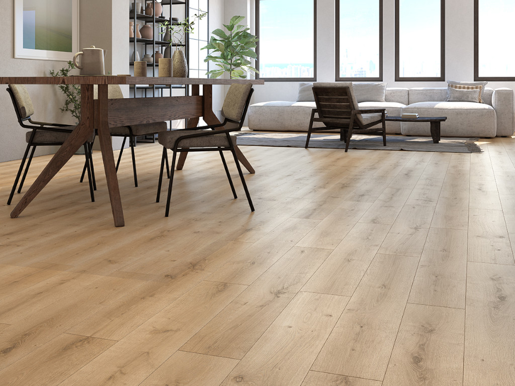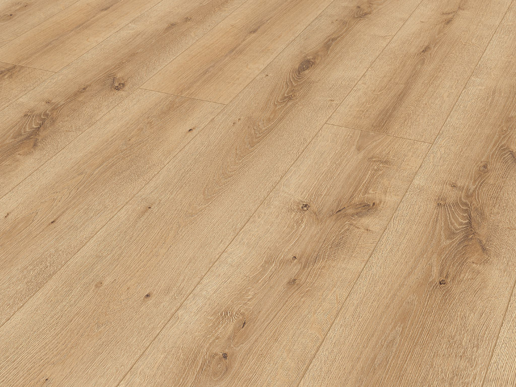 Die Dielen haben eine Breite von 19,2 cm, eine Länge von 128,5 cm und sind 7 mm stark. Laminat ist dreischichtig aufgebaut: Die oberste Schicht besteht aus dem Dekor, das mit dem robusten Overlay zusammen verpresst ist. Die Trägerplatte ist aus hochverdichteten Holzfasern gefertigt und unten sorgt der Gegenzug/Stabilisierungsfilm für Stabilität.Mithilfe der Klickverbindung kann der Boden problemlos schwimmend verlegt werden. In Wartezimmern, Büros oder Boutiquen mit kontinuierlicher Nutzung kann er mit der Nutzungsklasse (NK) 32 im gewerblichen Bereich punkten.