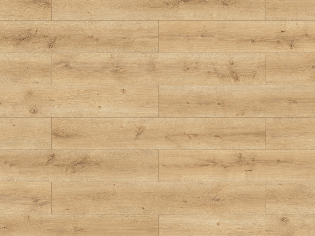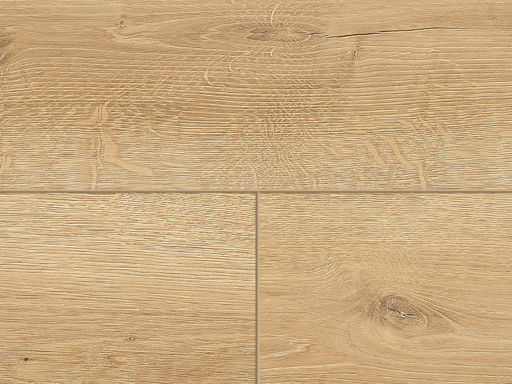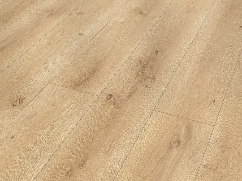 Die Dielen haben eine Breite von 19,2 cm, eine Länge von 128,5 cm und sind 7 mm stark. Der Laminat-Aufbau ist dreischichtig: Die strapazierfähige Oberfläche, die mit dem Dekor verpresst ist, die HDF-Träger-Platte mit Klickverbindung sowie der untere Gegenzug/Stabilisierungsfilm, der dem Verziehen der Diele entgegenwirkt.Mithilfe der Klickverbindung kann der Boden problemlos schwimmend verlegt werden. In Wartezimmern, Büros oder Boutiquen mit kontinuierlicher Nutzung kann er mit der Nutzungsklasse (NK) 32 im gewerblichen Bereich punkten.