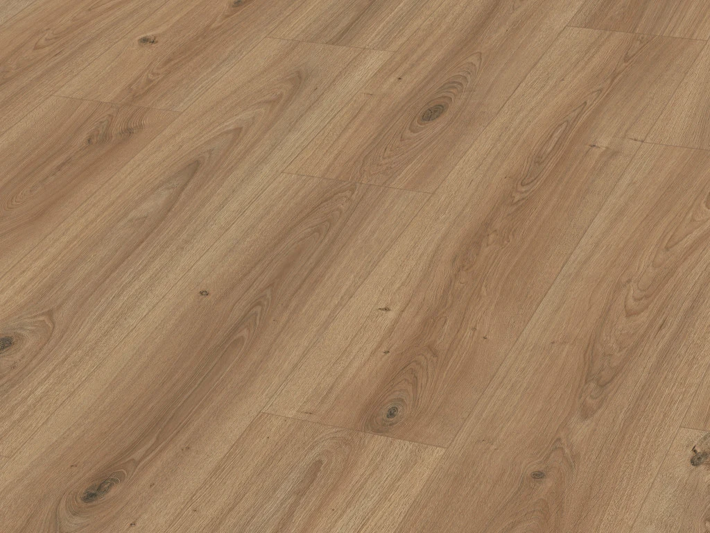 Die mit 24,4 cm extra breiten Dielen dieses Laminatbodens vermitteln ein Gefühl von Exklusivität. Je größer der Raum, desto besser kommt dieses Format zur Geltung.