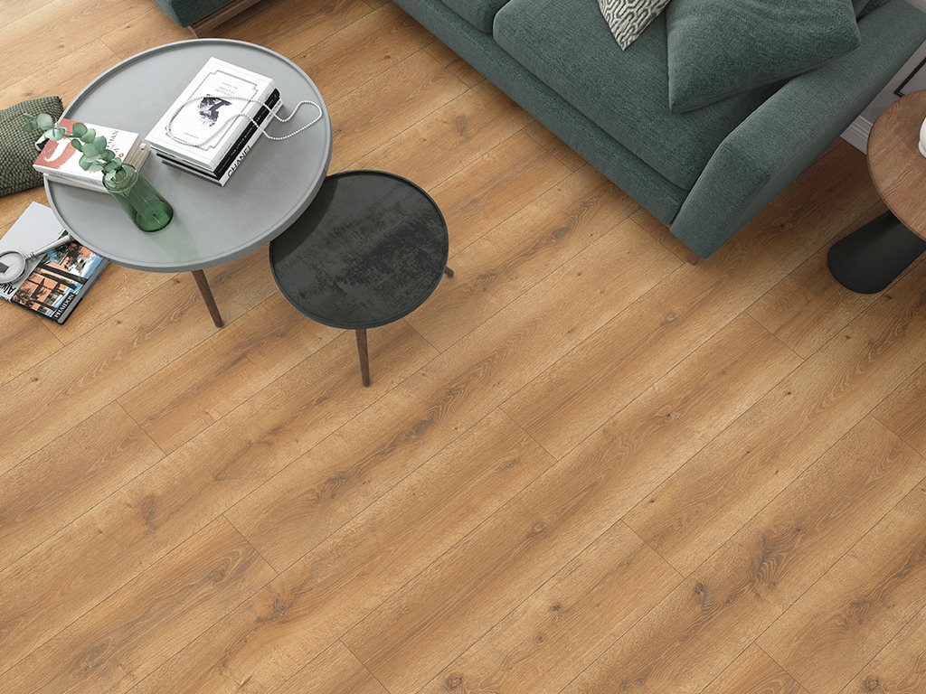 Das Dekor in authentischer Eichenholzoptik vermittelt fühlbare Wärme und Behaglichkeit. Landhausdielen bringen mit ihrem natürlich wirkenden 1-Stab-Design südliches Flair in Dein Zuhause und schaffen eine Atmosphäre voller Ruhe und Gemütlichkeit. Die umlaufende 4-V-Fuge hebt jede einzelne Diele hervor und gibt der Fläche so eine schöne Struktur. Dank der glatten Struktur entsteht eine angenehm ausgleichende Raumatmosphäre, wie beim Blick auf einen ruhigen See.
