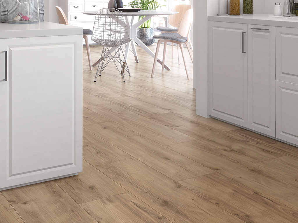 Die Stärke des Laminats beträgt 8 mm – das entspricht einer leichten Nutzung im gewerblichen Bereich. Dank der Klickverbindung lässt sich der Boden ganz einfach schwimmend verlegen. Dieses Laminat der Nutzungsklasse 23 eignet sich im privaten Bereich für stark beanspruchte Flächen wie z. B. Küchen, Treppenflure oder Eingangsbereiche. In Wartezimmern, Büros oder Boutiquen mit kontinuierlicher Nutzung kann es mit der Nutzungsklasse (NK) 32 auch im gewerblichen oder privaten Bereich punkten. In Feuchträumen wie Küche oder Bad kann dieser Artikel dank seiner Resistenz gegen Nässe bedenkenlos verlegt werden. Auch die Verlegung über einer Warmwasserfußbodenheizung ist kein Problem.