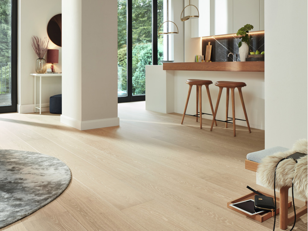 Dieser Boden aus Eichenholz stellt seine zeitlos schöne Wirkung unter Beweis – Echte Eiche spricht für sich selbst. Doch auch technisch kann Eiche punkten: aufgrund ihrer hohen Rohdichte wirkt diese Holzart besonders wärmeleitend und sorgt für stets warme Füße.