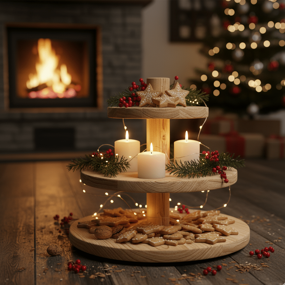 Eine Etagere für Weihnachtsgebäck, Dekorationen oder Kerzen lässt sich ganz leicht aus Holzplatten bauen, ist günstiger und hochwertiger als ein gekauftes Produkt: das perfekte Projekt für deine persönliche Präsentationsfläche in der Adventszeit.