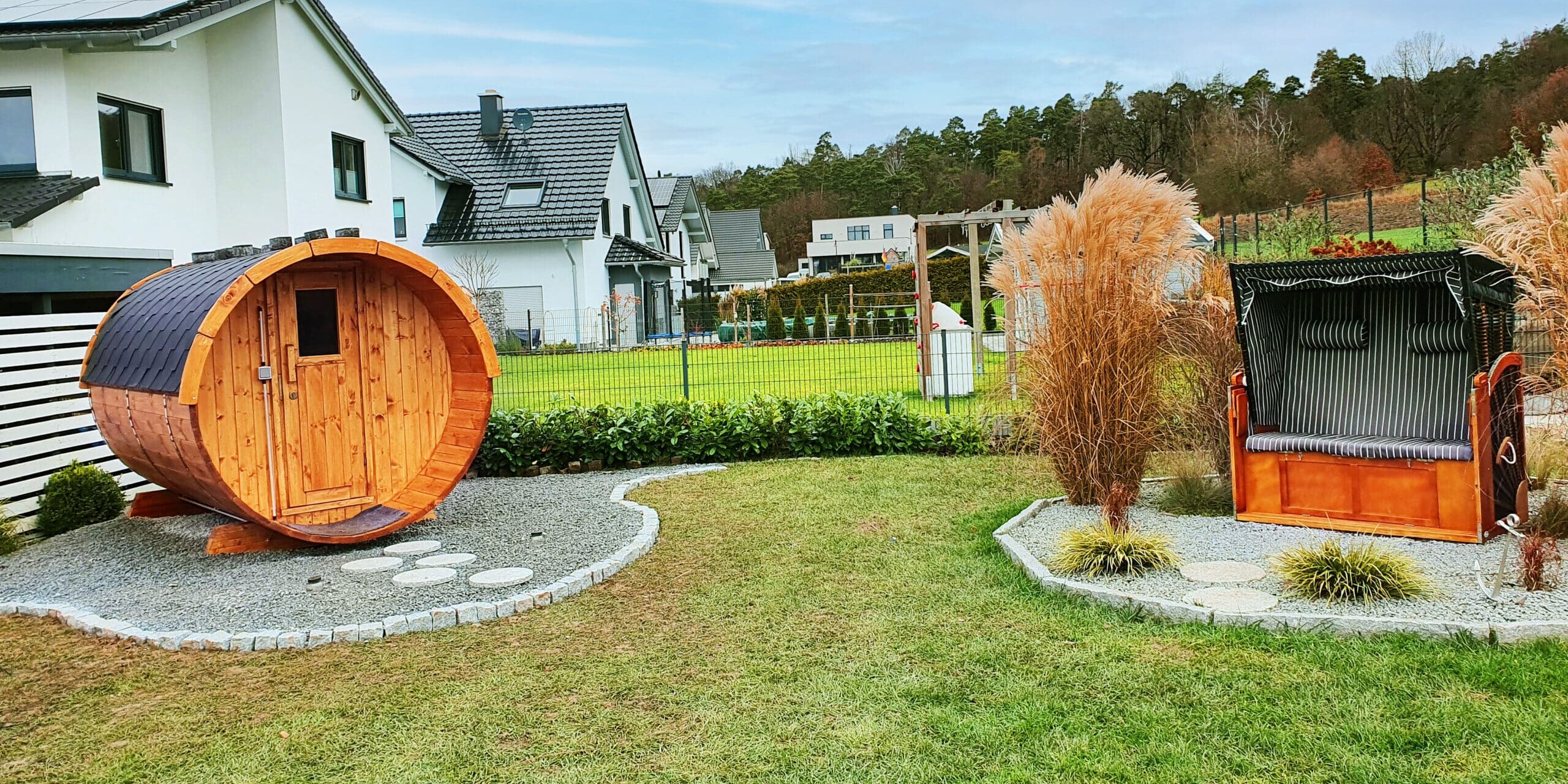 Fasssaunen beginnen bei etwa 2 m Länge und passen auch in kleinere Gärten. Cube- und klassische Saunen benötigen meist etwas mehr Raum. Plane gegebenenfalls zusätzlich Platz für einen Vorraum, eine kleine Terrasse oder eine Außendusche ein.