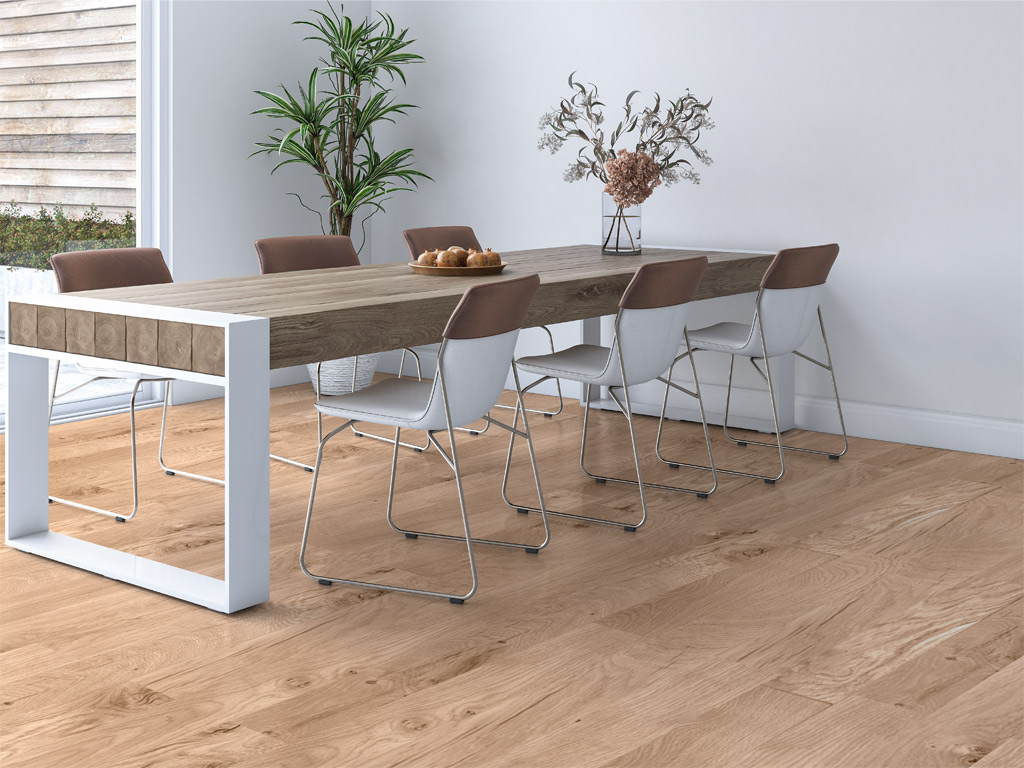 Massivholzdielen sind aufgrund ihrer Natürlichkeit und Individualität von reiner und unverwechselbarer Schönheit. Dieser Eichenboden begeistert durch seine klassische und elegante Optik und integriert sich wunderbar in moderne wie traditionelle Einrichtungsstile. Dabei beeindrucken diese Luxusdielen nicht nur optisch. Ein Boden aus Eiche passt sich trockener Luft und höherer Luftfeuchte flexibel an.