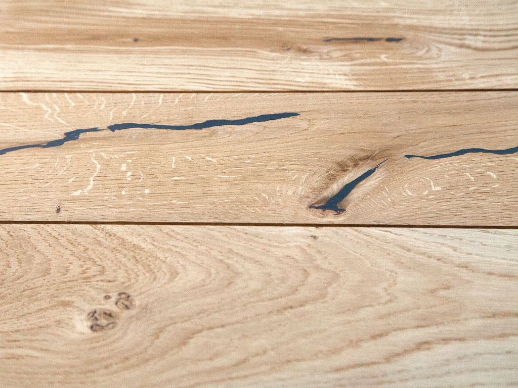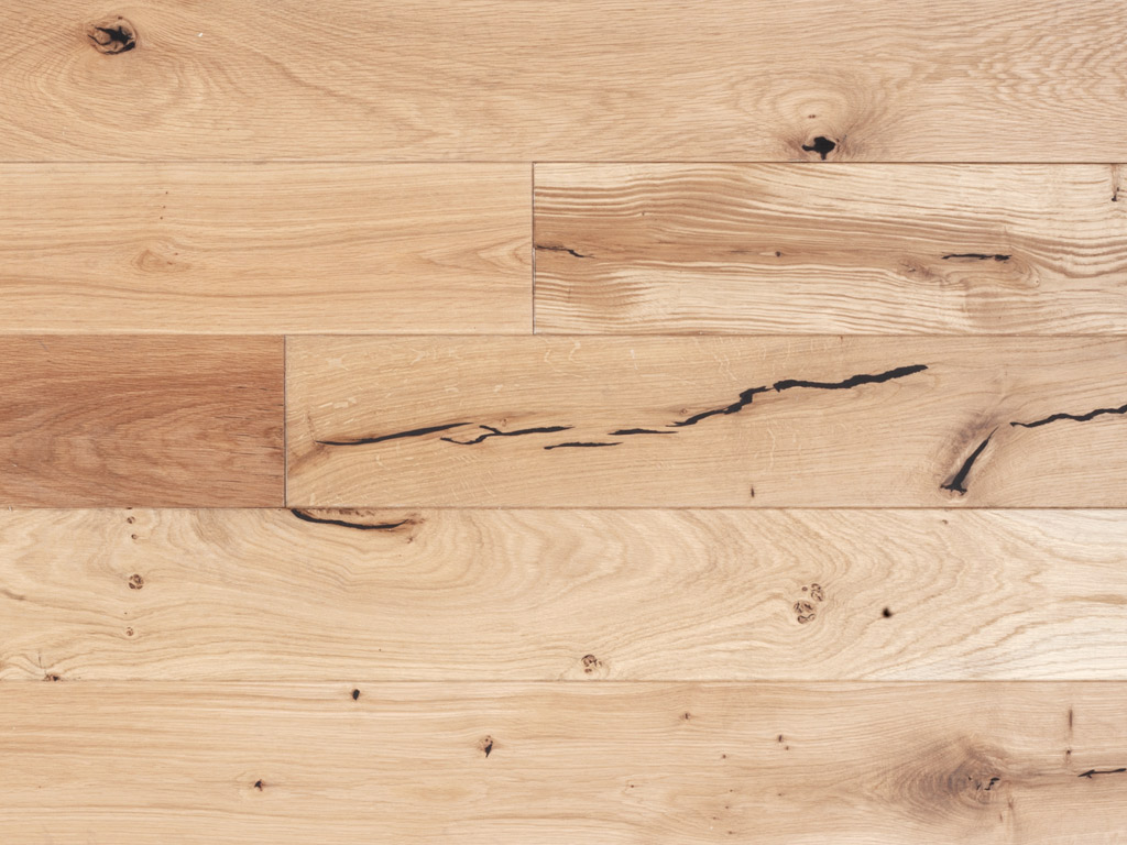 Die an vier Seiten umlaufende Fase strukturiert das Verlegebild und verleiht ihm ein gleichmäßiges Muster. Individuelle Struktur und ausdrucksstarke Maserung, welche durch kleine schwarz-verspachtelte Risse und Astungen ihre lebhafte Sortierung bekommt. Hochwertige natürliche Öle zur Oberflächenbehandlung lassen das Holz atmen und geben ihm Schutz. Bei der geschliffenen Oberfläche werden Vertiefungen in der Diele perfekt ausgeglichen. Der Boden wird so vollkommen eben.