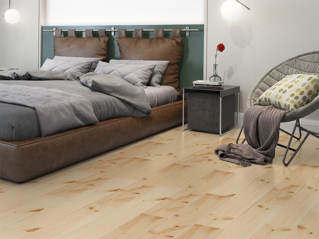 Der helle, freundliche Bodenbelag aus dem Holz der Kiefer besitzt eine lebhafte Maserung, die perfekt zu skandinavischen Einrichtungsstilen passt. Nadelhölzer sind verhältnismäßig weich und daher nicht auf Schreibtischstuhlrollen ausgelegt. Die an vier Seiten umlaufende Fase hebt den Dielencharakter besonders hervor.